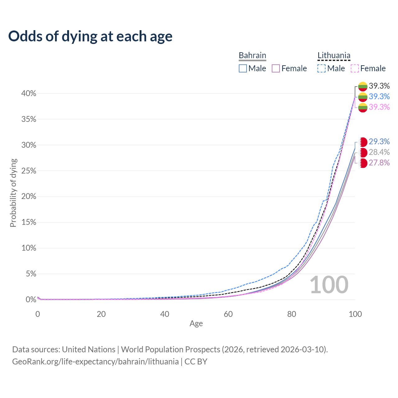 This life expectancy calculator shows the odds of living to 100, 95, 90, and below based on current age for both males and females in Bahrain and Lithuania, along with mean and median age of death. The calculations are based on the 2026 life tables (actuarial tables) from the UN World Population Prospects.