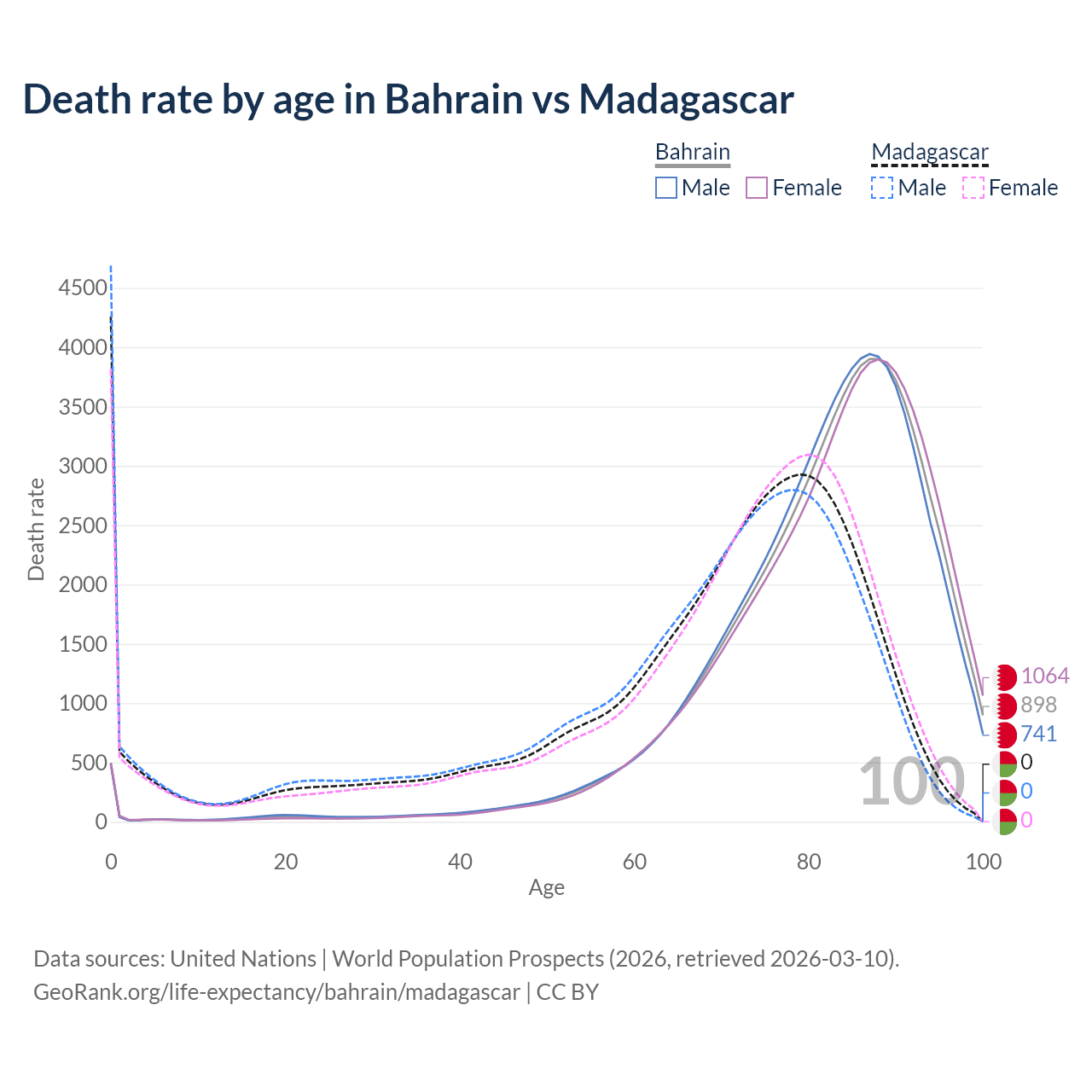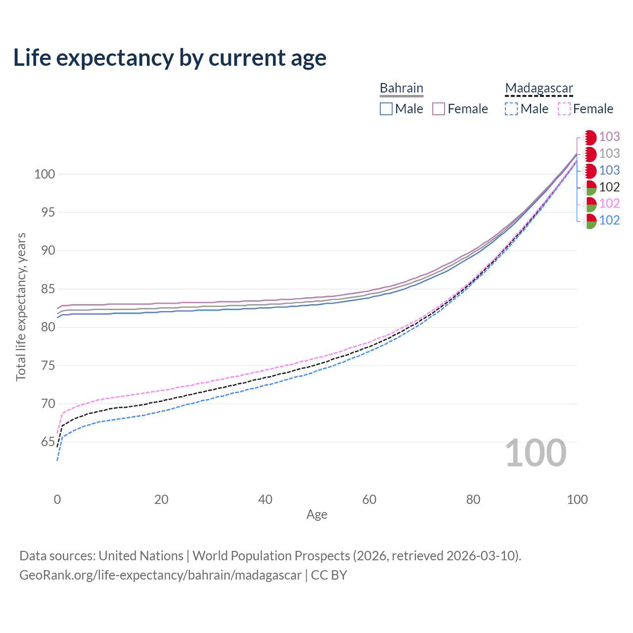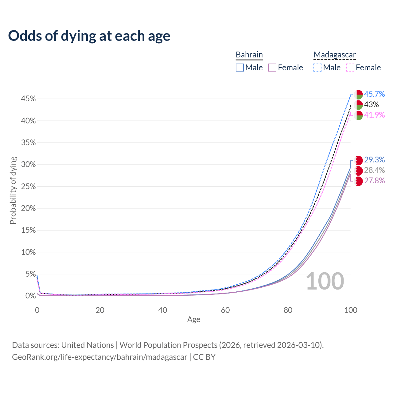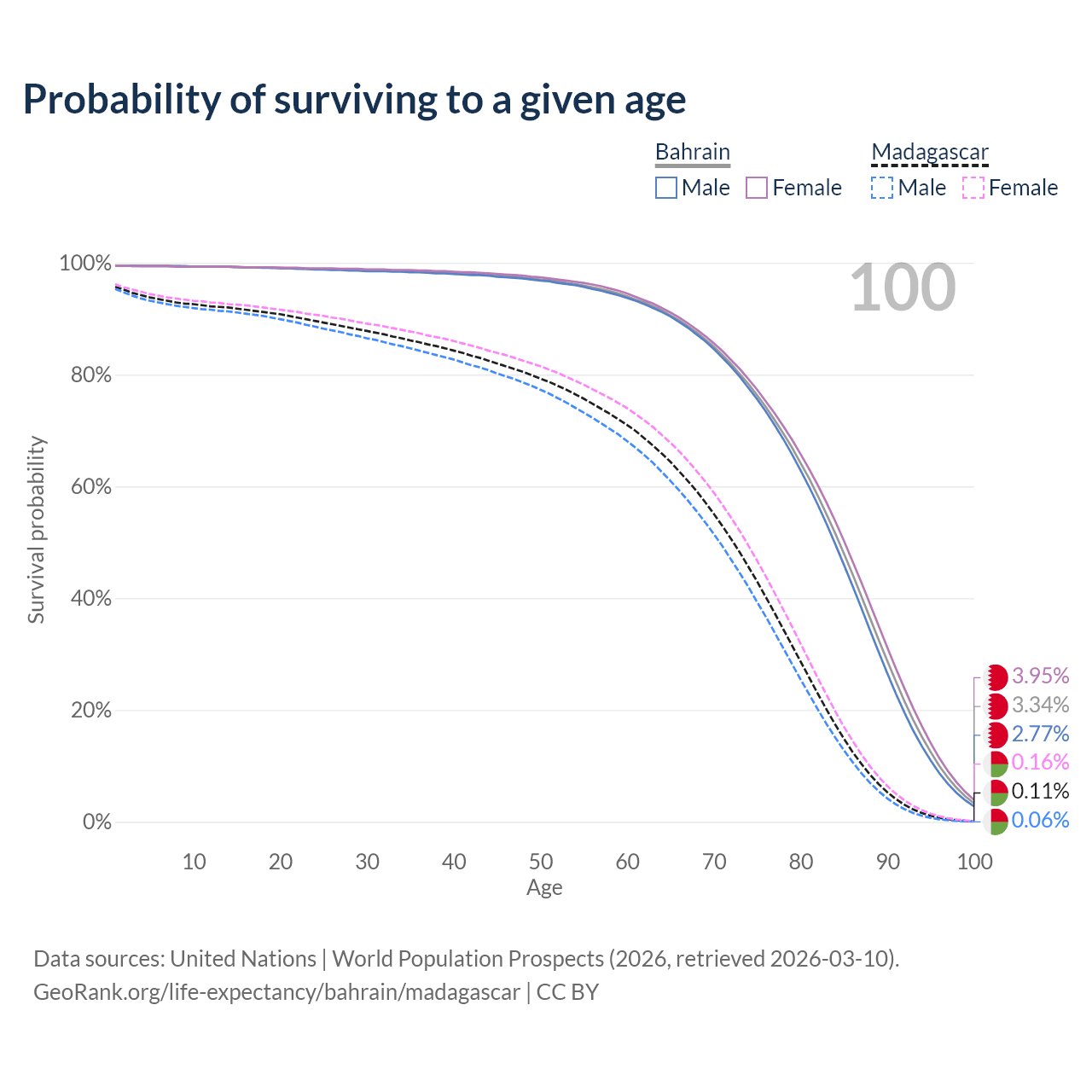 This life expectancy calculator shows the odds of living to 100, 95, 90, and below based on current age for both males and females in Bahrain and Madagascar, along with mean and median age of death. The calculations are based on the 2026 life tables (actuarial tables) from the UN World Population Prospects.