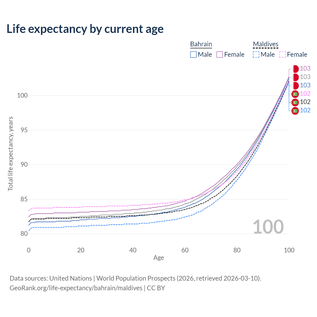 This life expectancy calculator shows the odds of living to 100, 95, 90, and below based on current age for both males and females in Bahrain and Maldives, along with mean and median age of death. The calculations are based on the 2026 life tables (actuarial tables) from the UN World Population Prospects.