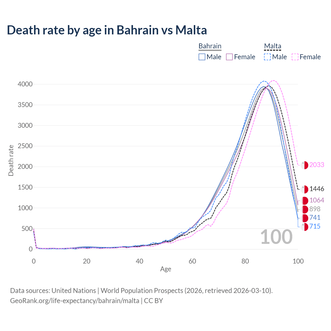 In Bahrain, the most common age of death is 88, compared to 89 in Malta. The median age of death is 84.4 in Bahrain and 86.3 in Malta, meaning only half of each cohort is expected to live past that age.