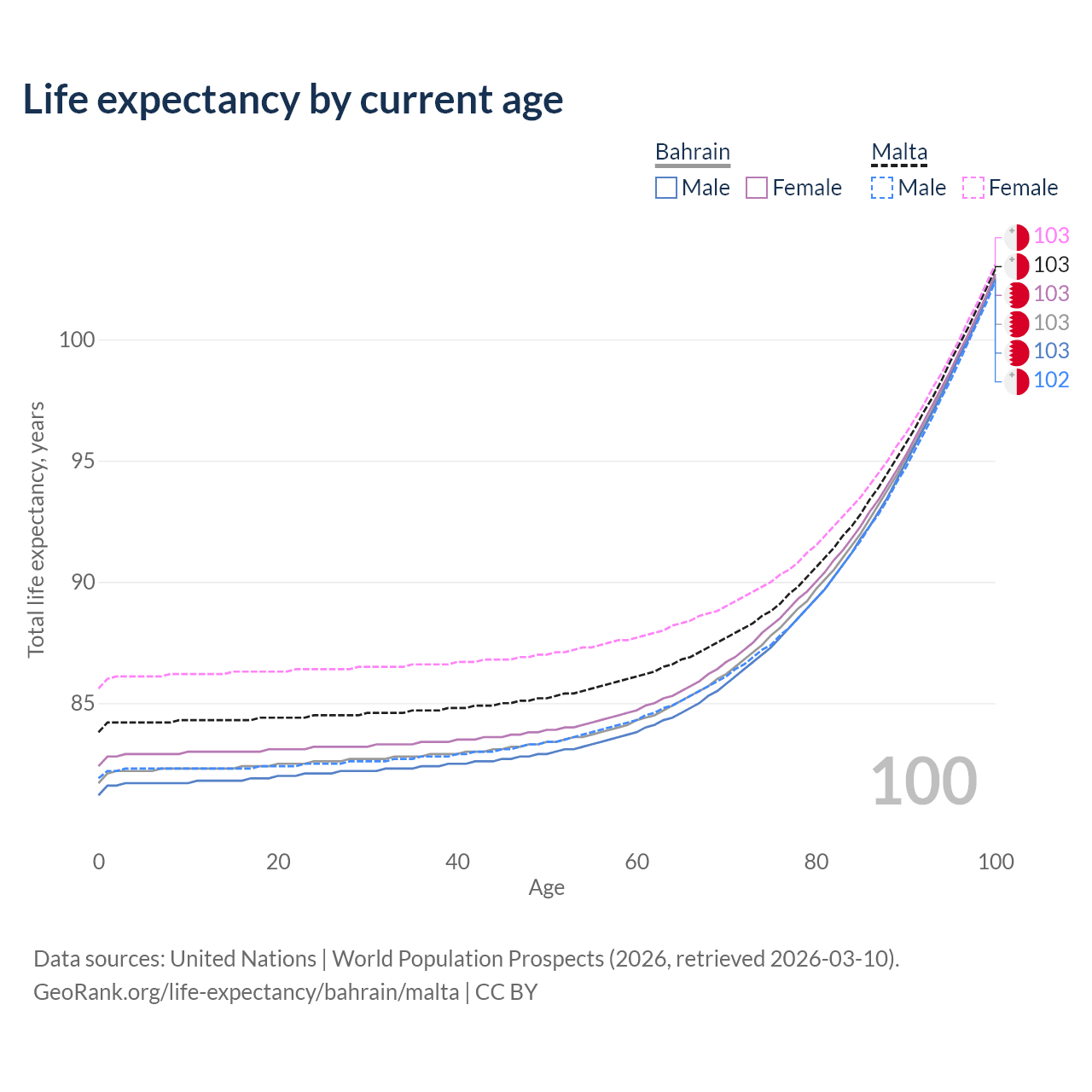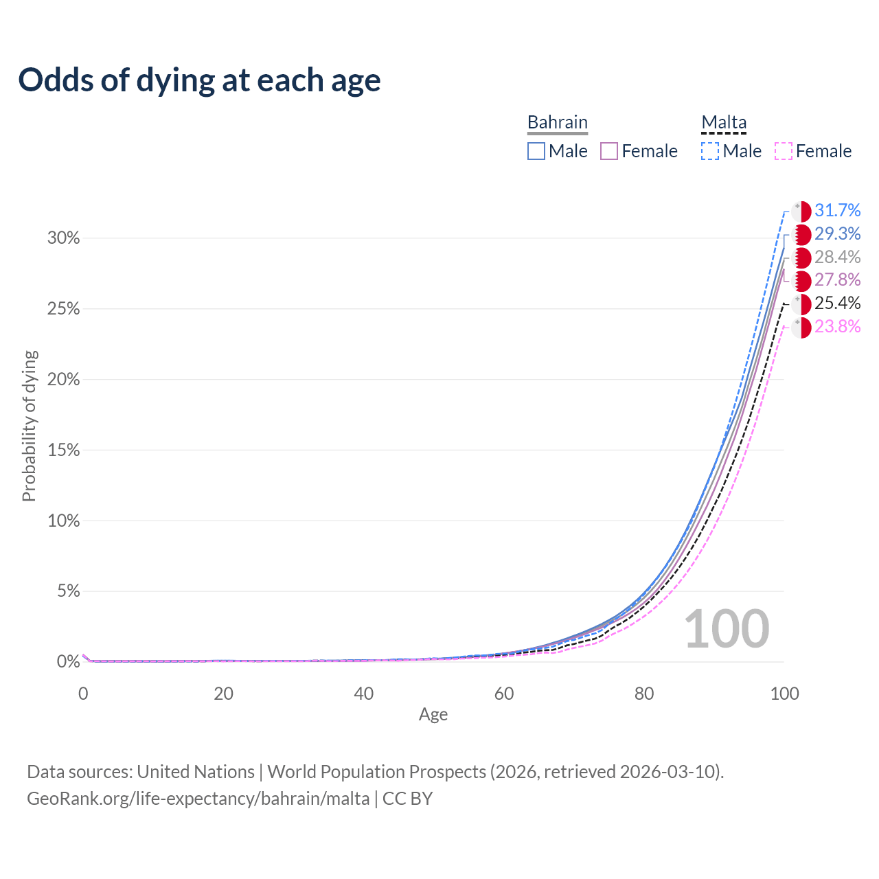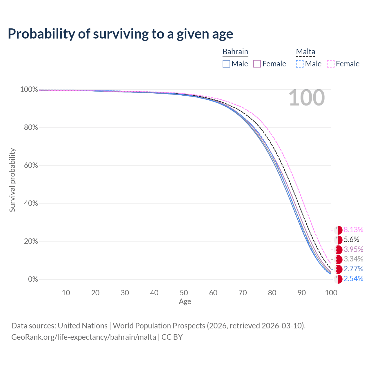 This life expectancy calculator shows the odds of living to 100, 95, 90, and below based on current age for both males and females in Bahrain and Malta, along with mean and median age of death. The calculations are based on the 2026 life tables (actuarial tables) from the UN World Population Prospects.