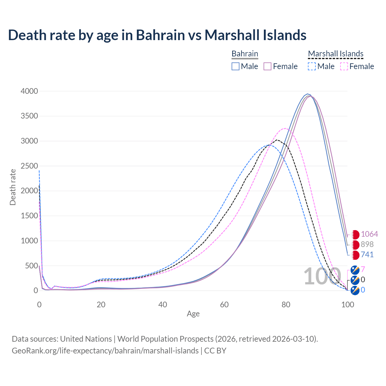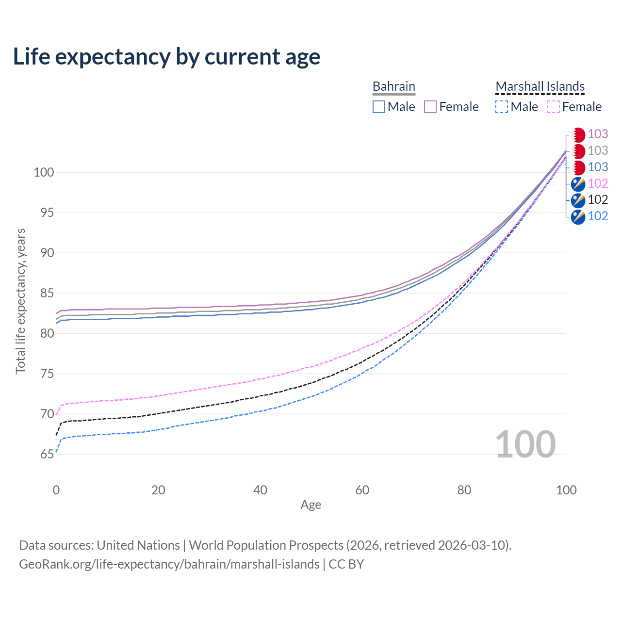 This life expectancy calculator shows the odds of living to 100, 95, 90, and below based on current age for both males and females in Bahrain and the Marshall Islands, along with mean and median age of death. The calculations are based on the 2026 life tables (actuarial tables) from the UN World Population Prospects.