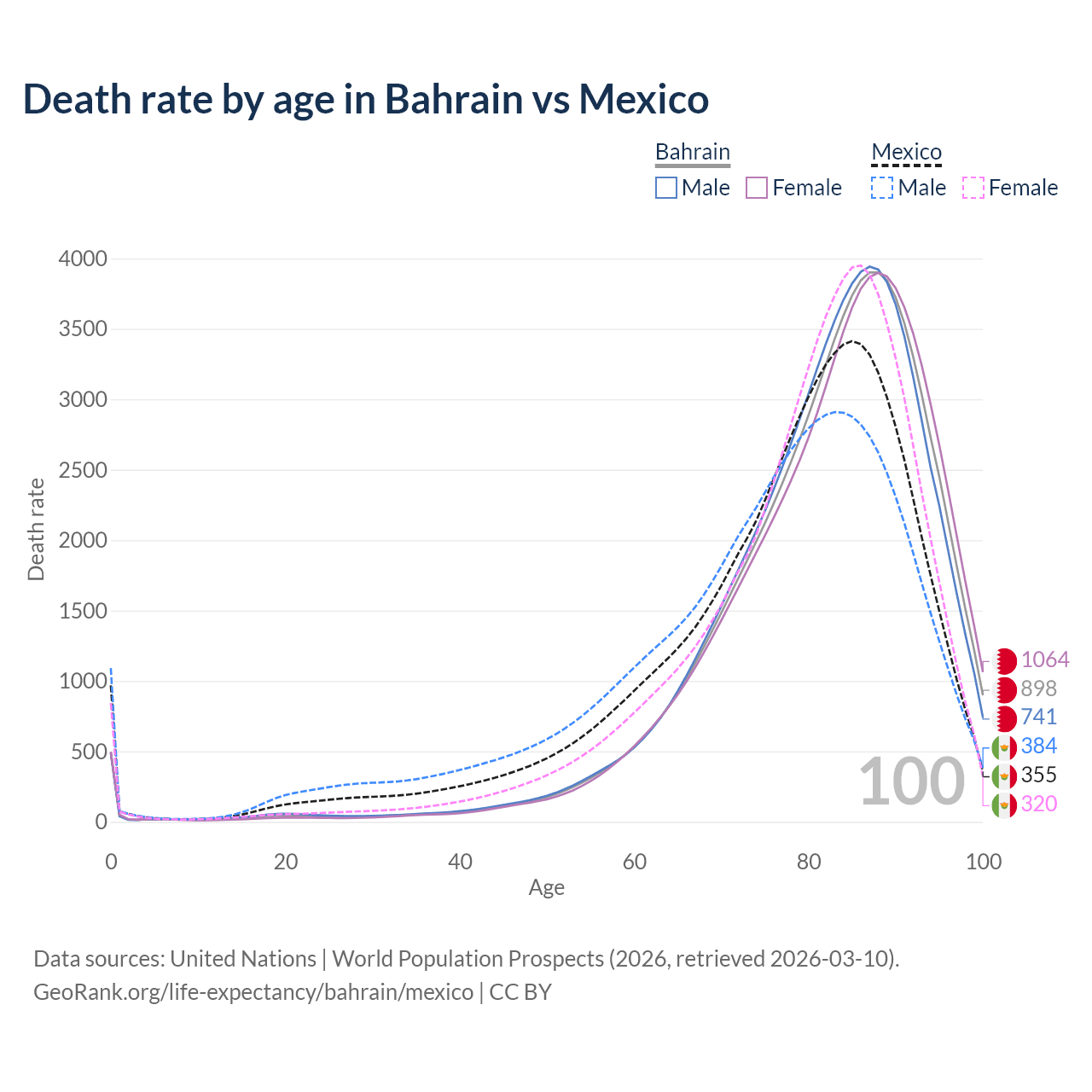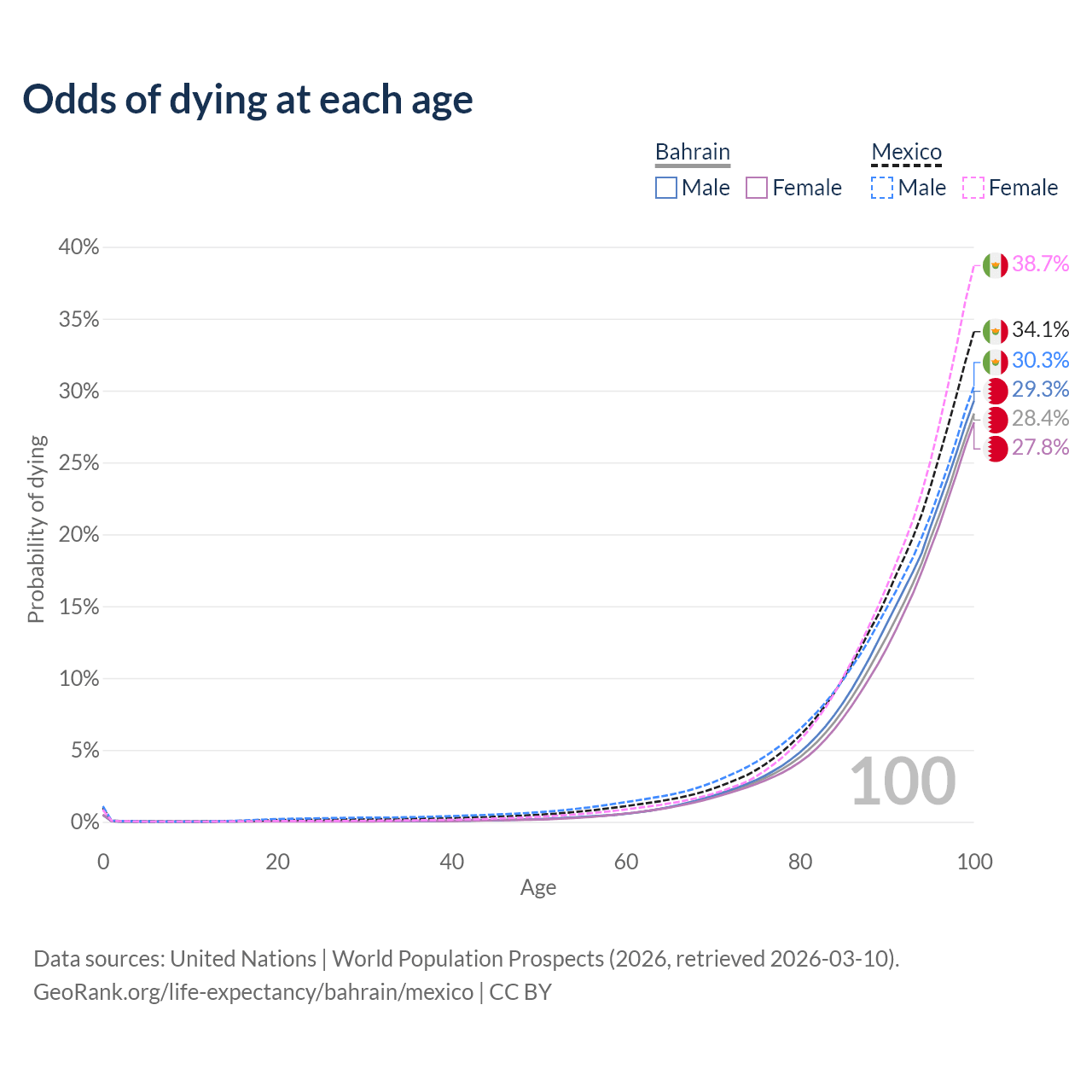 This life expectancy calculator shows the odds of living to 100, 95, 90, and below based on current age for both males and females in Bahrain and Mexico, along with mean and median age of death. The calculations are based on the 2026 life tables (actuarial tables) from the UN World Population Prospects.
