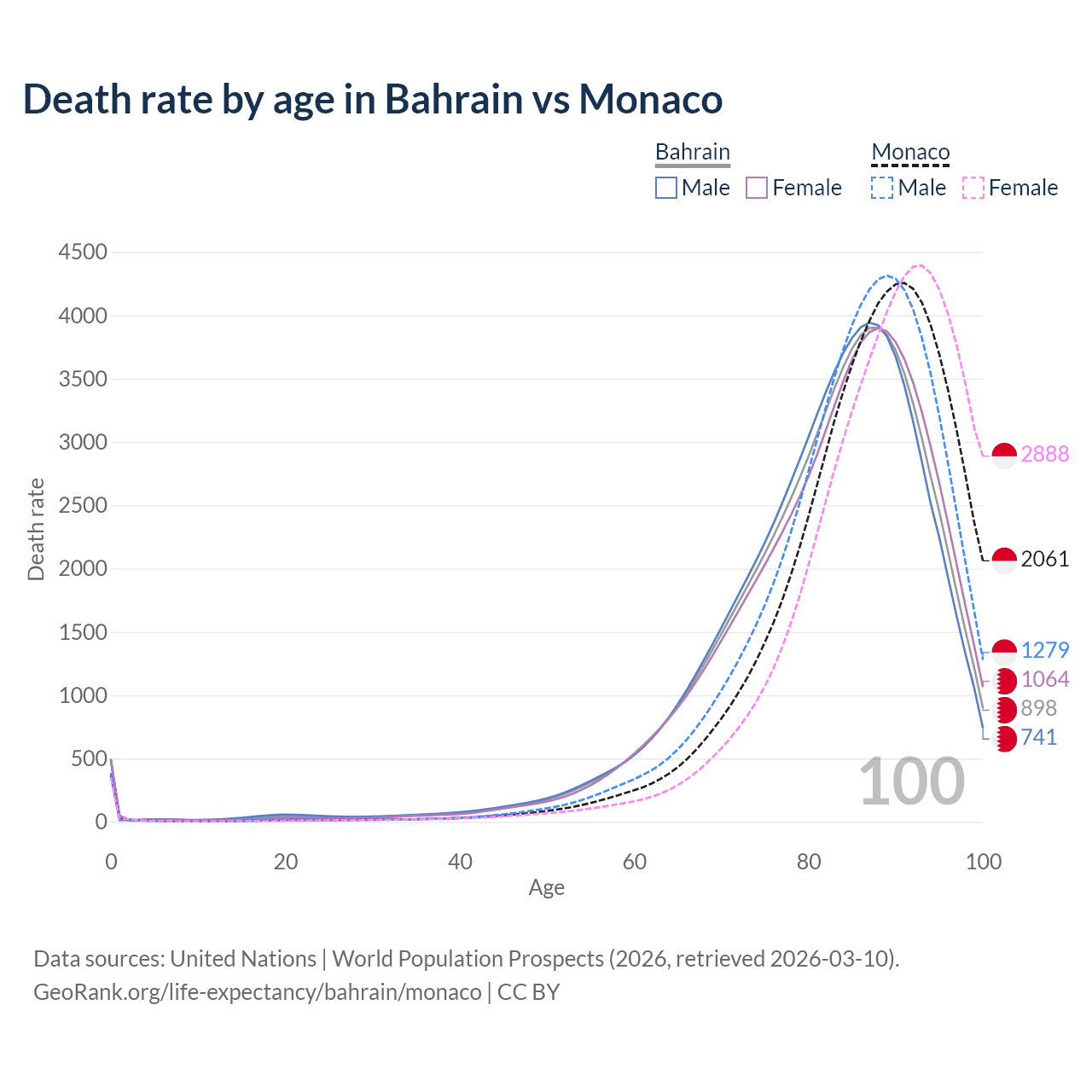 In Bahrain, the most common age of death is 88, compared to 91 in Monaco. The median age of death is 84.4 in Bahrain and 88.7 in Monaco, meaning only half of each cohort is expected to live past that age.