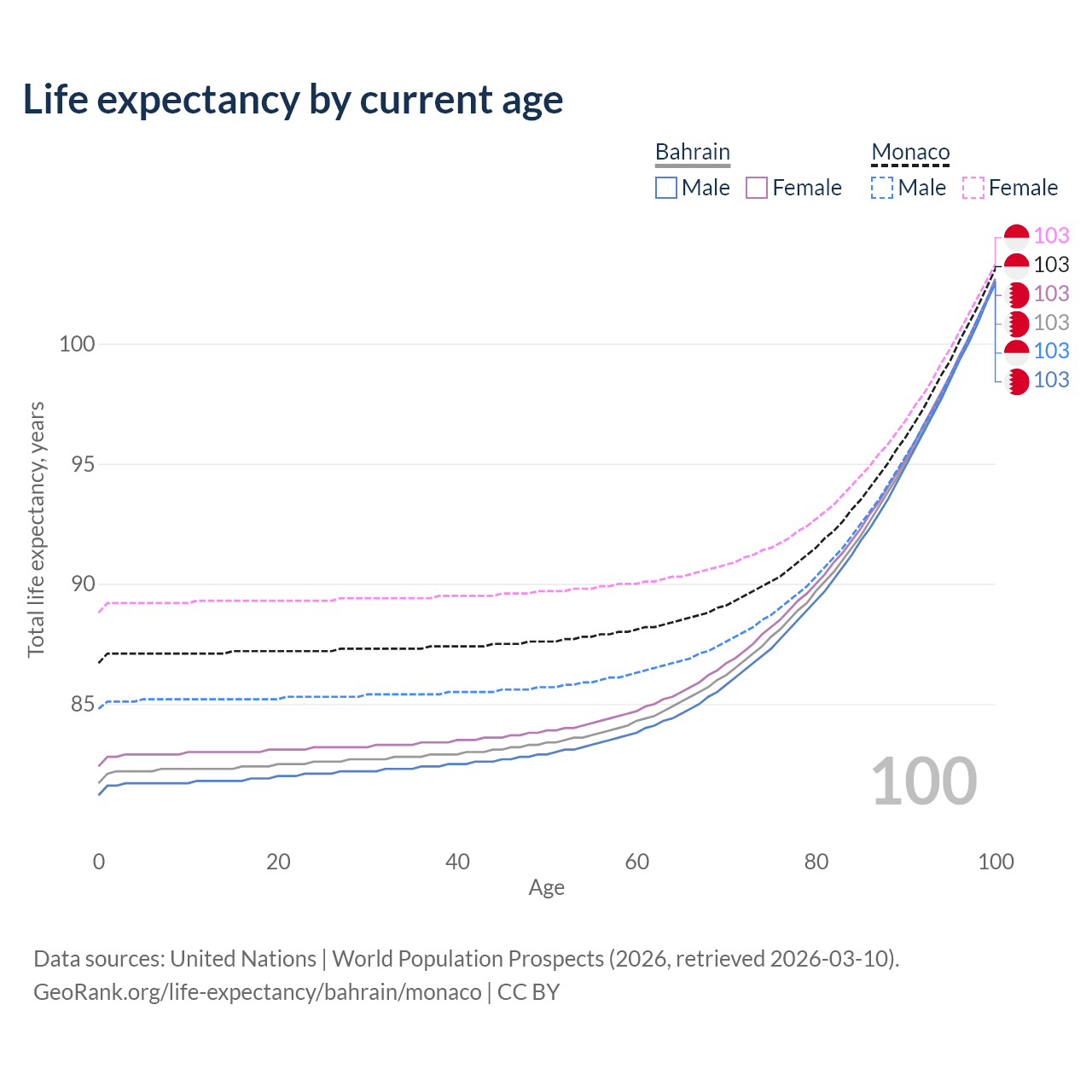 This life expectancy calculator shows the odds of living to 100, 95, 90, and below based on current age for both males and females in Bahrain and Monaco, along with mean and median age of death. The calculations are based on the 2026 life tables (actuarial tables) from the UN World Population Prospects.