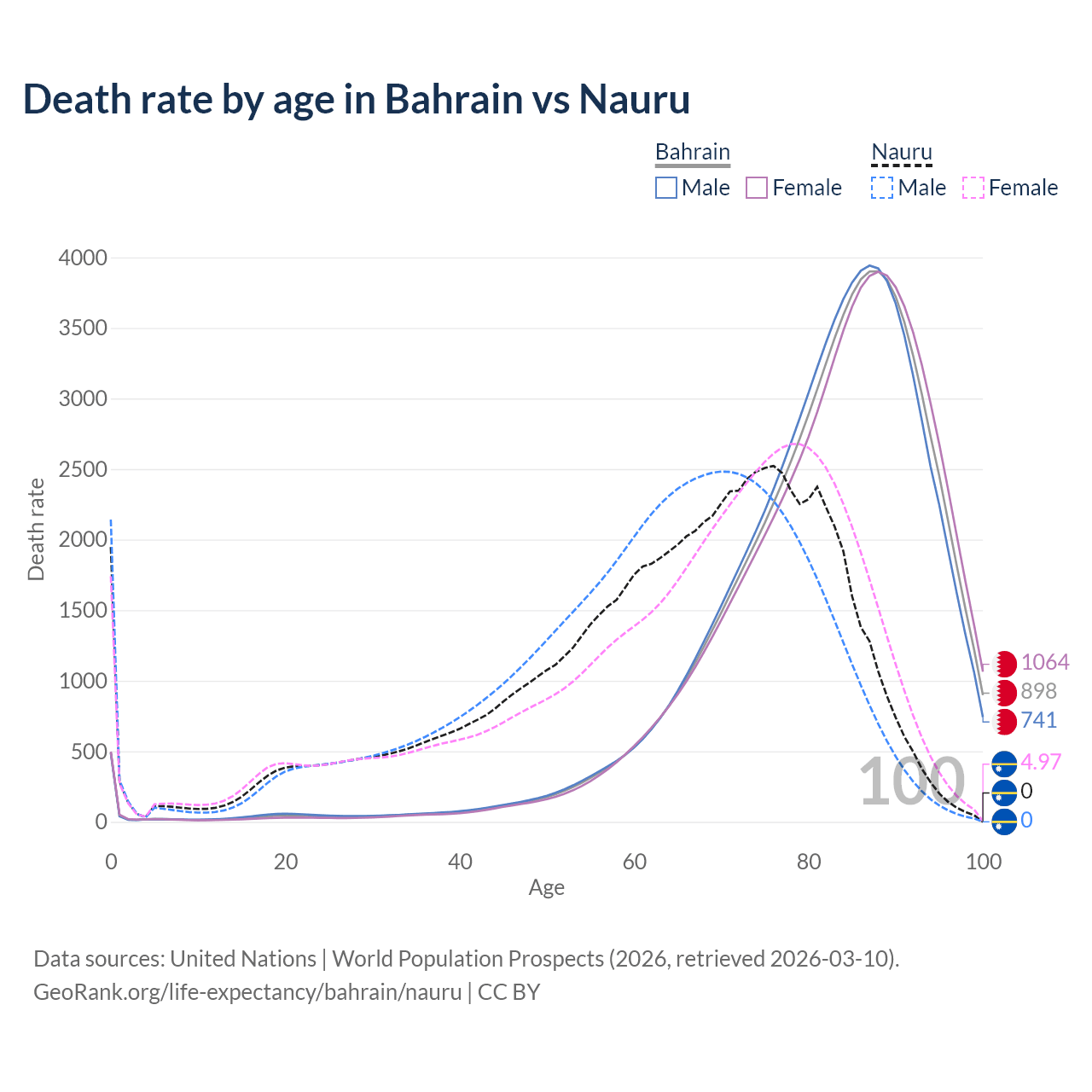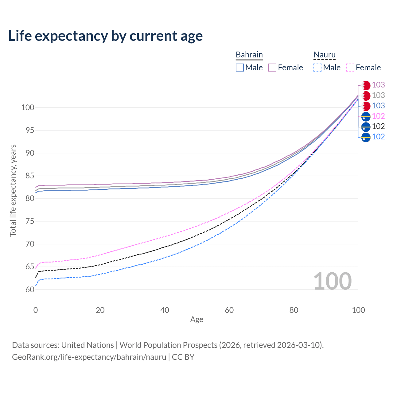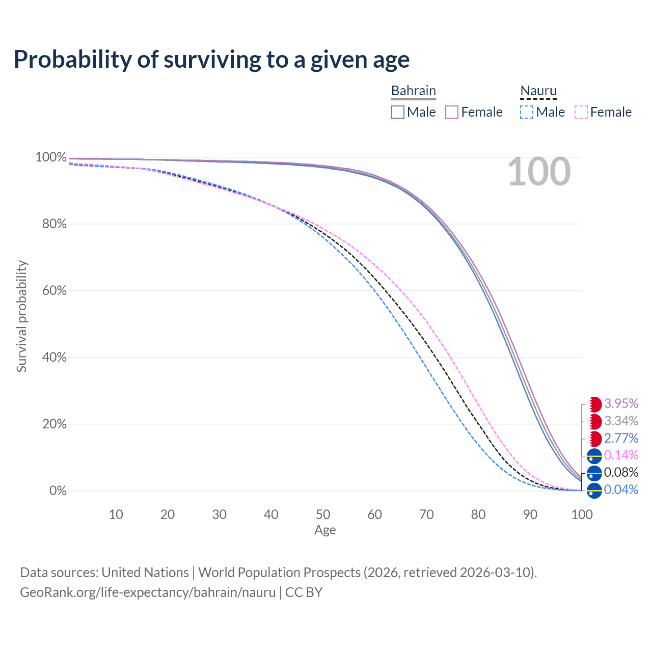 This life expectancy calculator shows the odds of living to 100, 95, 90, and below based on current age for both males and females in Bahrain and Nauru, along with mean and median age of death. The calculations are based on the 2026 life tables (actuarial tables) from the UN World Population Prospects.