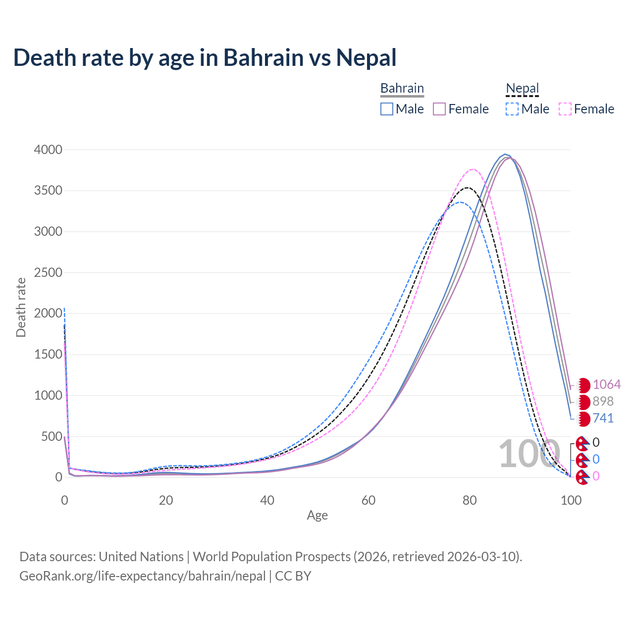 In Bahrain, the most common age of death is 88, compared to 80 in Nepal. The median age of death is 84.4 in Bahrain and 75.4 in Nepal, meaning only half of each cohort is expected to live past that age.