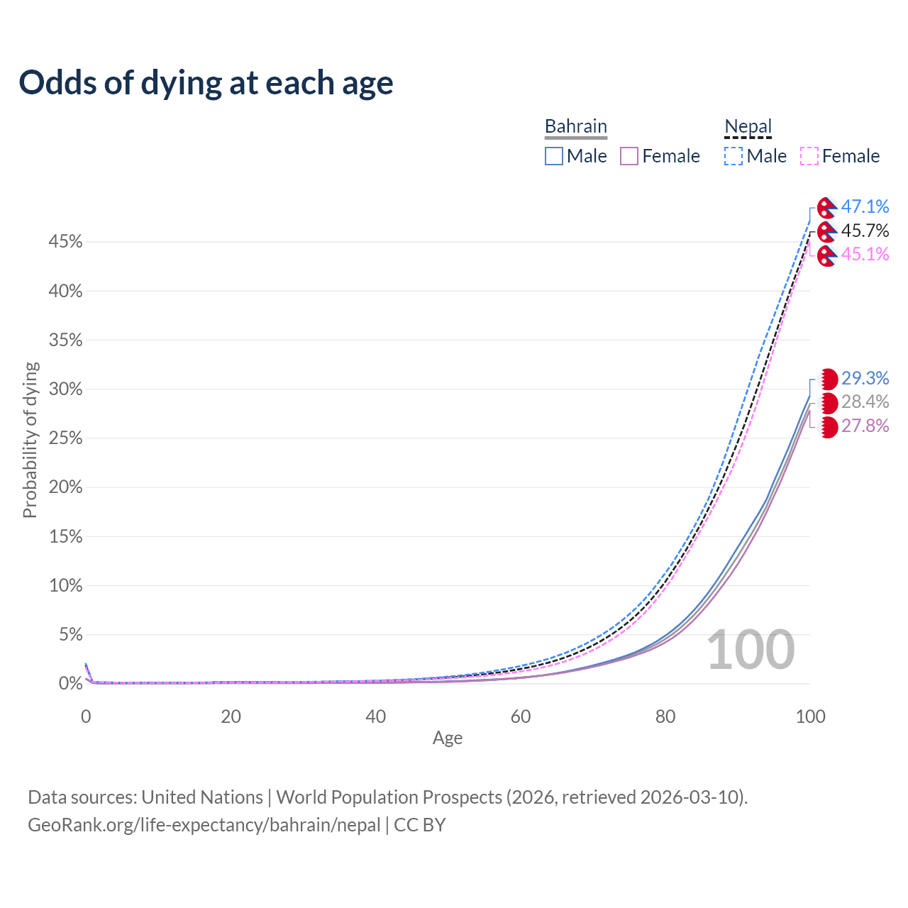 This life expectancy calculator shows the odds of living to 100, 95, 90, and below based on current age for both males and females in Bahrain and Nepal, along with mean and median age of death. The calculations are based on the 2026 life tables (actuarial tables) from the UN World Population Prospects.
