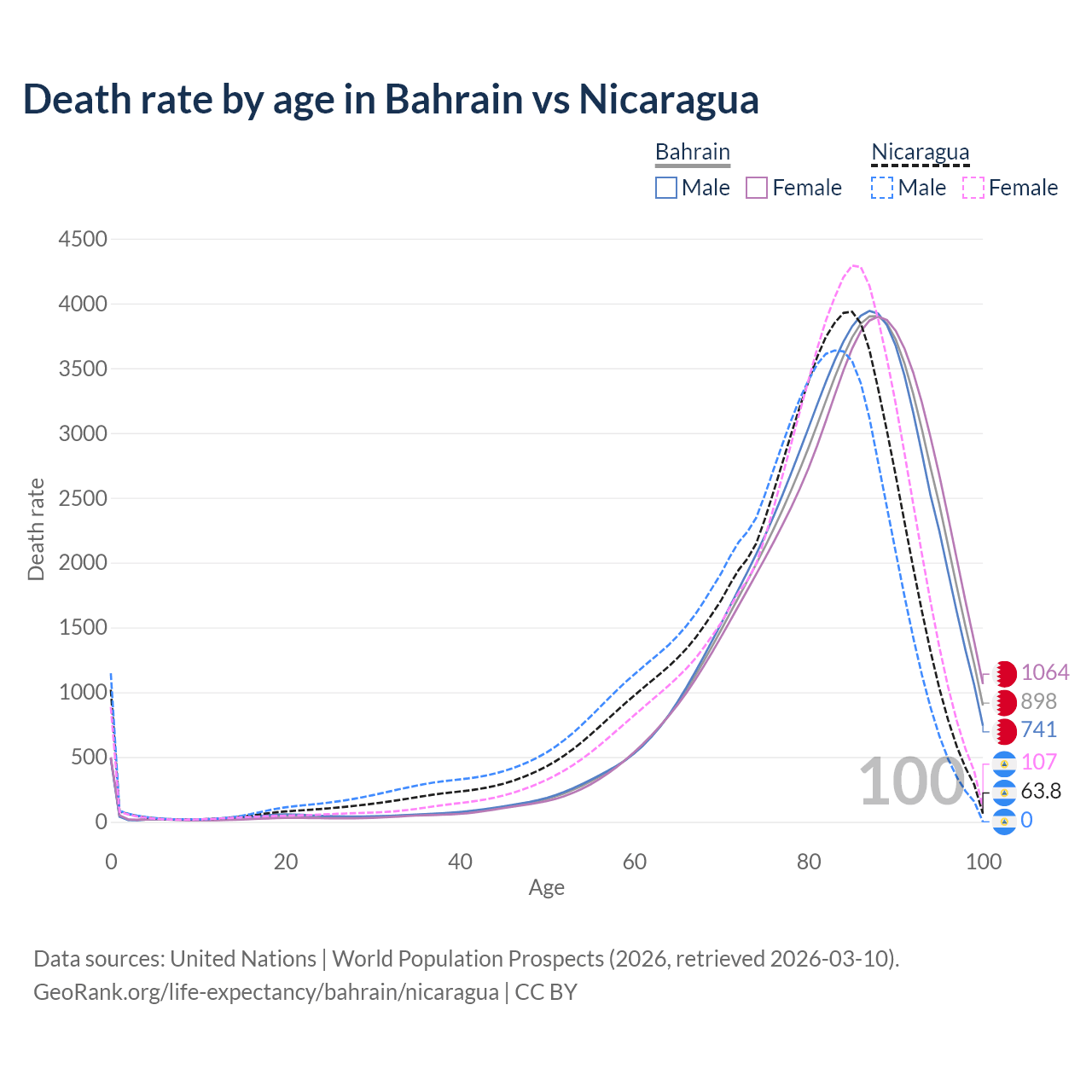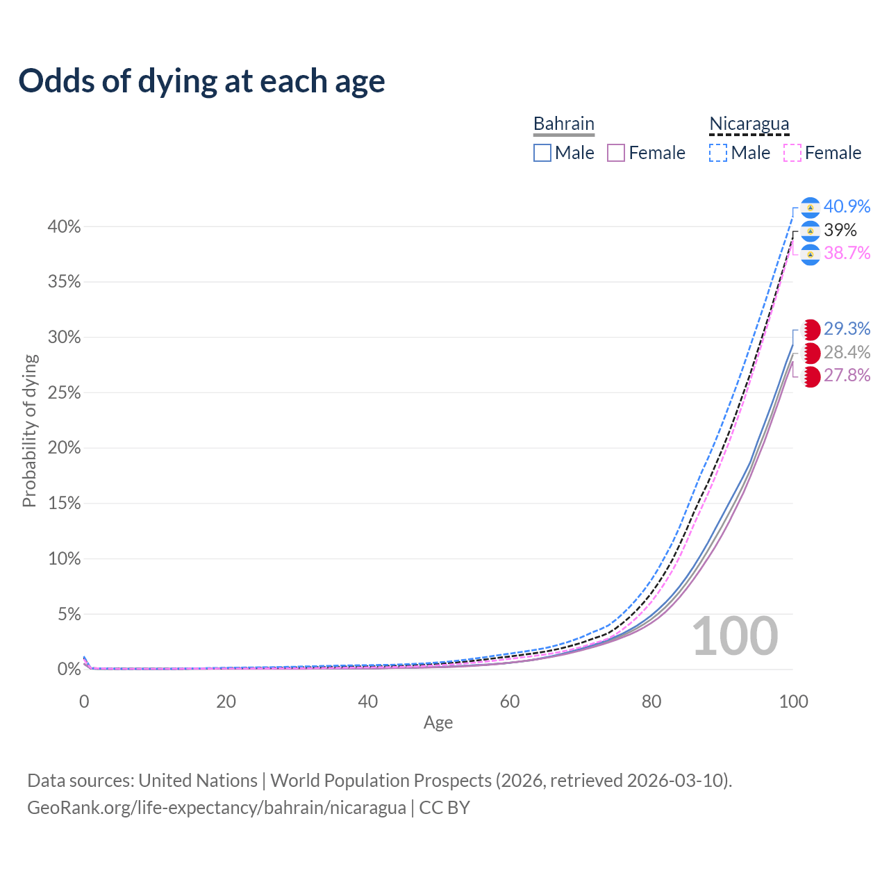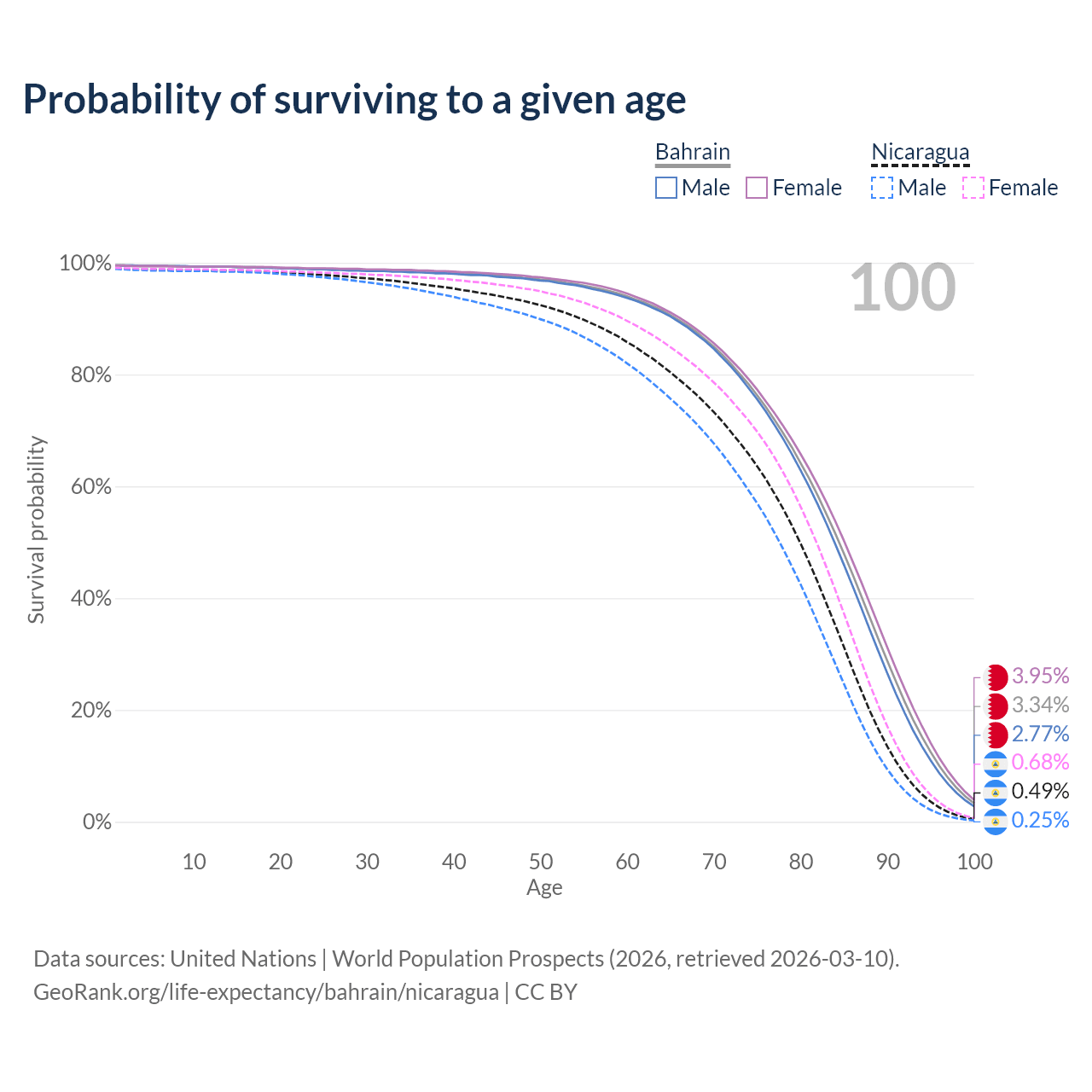 This life expectancy calculator shows the odds of living to 100, 95, 90, and below based on current age for both males and females in Bahrain and Nicaragua, along with mean and median age of death. The calculations are based on the 2026 life tables (actuarial tables) from the UN World Population Prospects.
