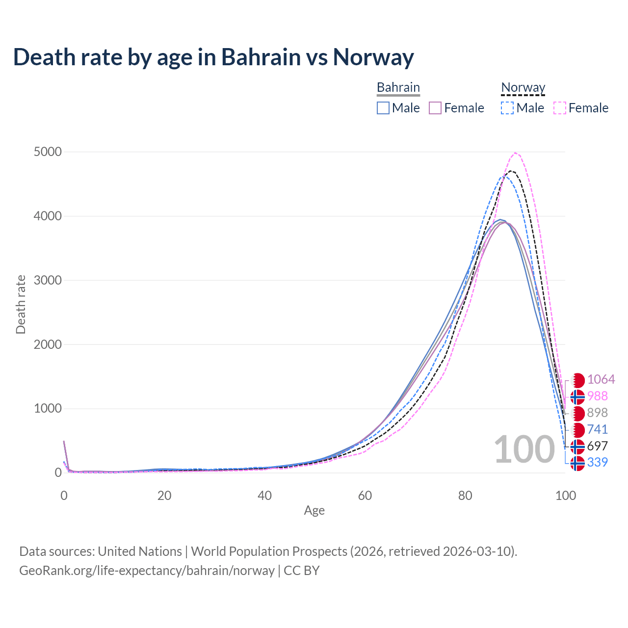 This life expectancy calculator shows the odds of living to 100, 95, 90, and below based on current age for both males and females in Bahrain and Norway, along with mean and median age of death. The calculations are based on the 2026 life tables (actuarial tables) from the UN World Population Prospects.