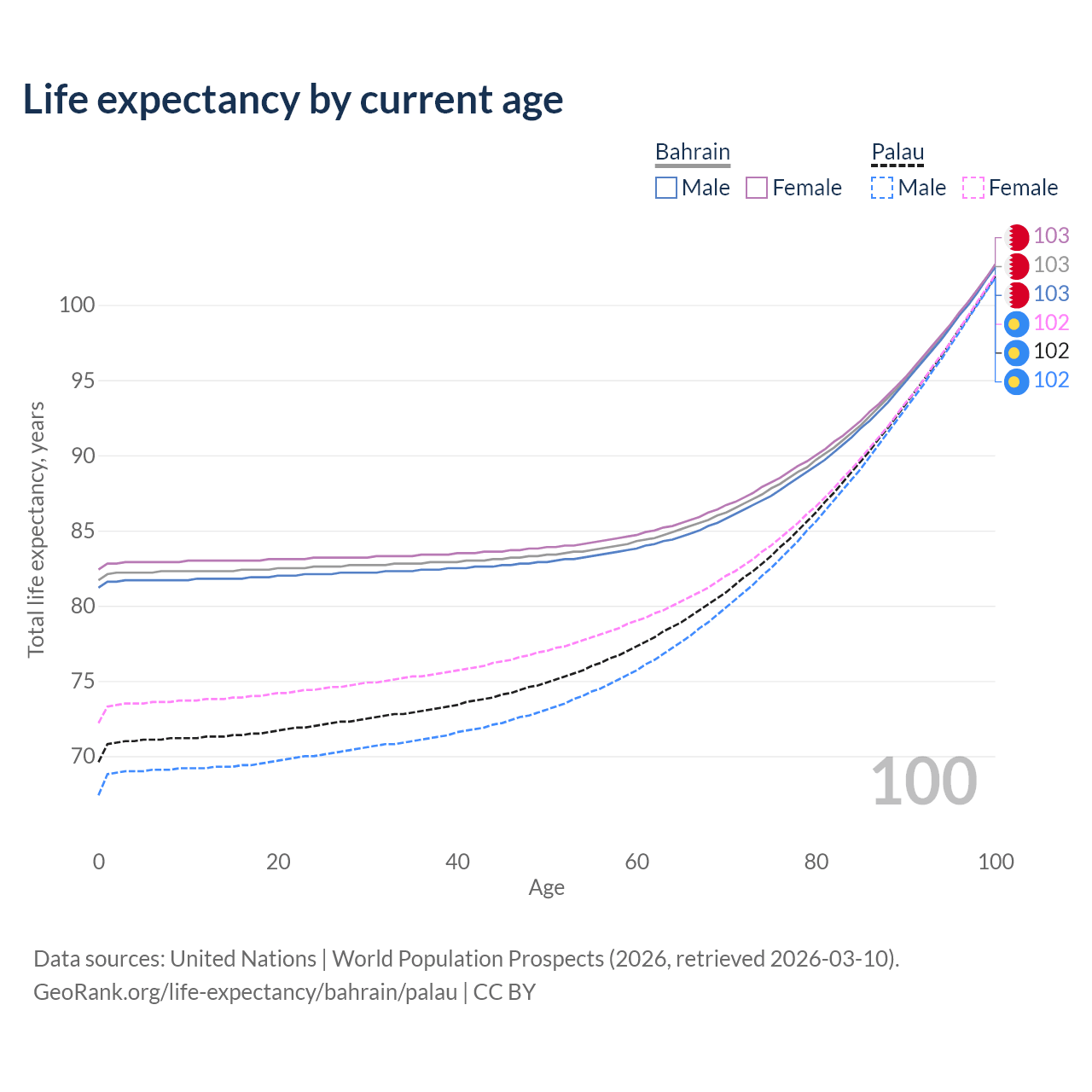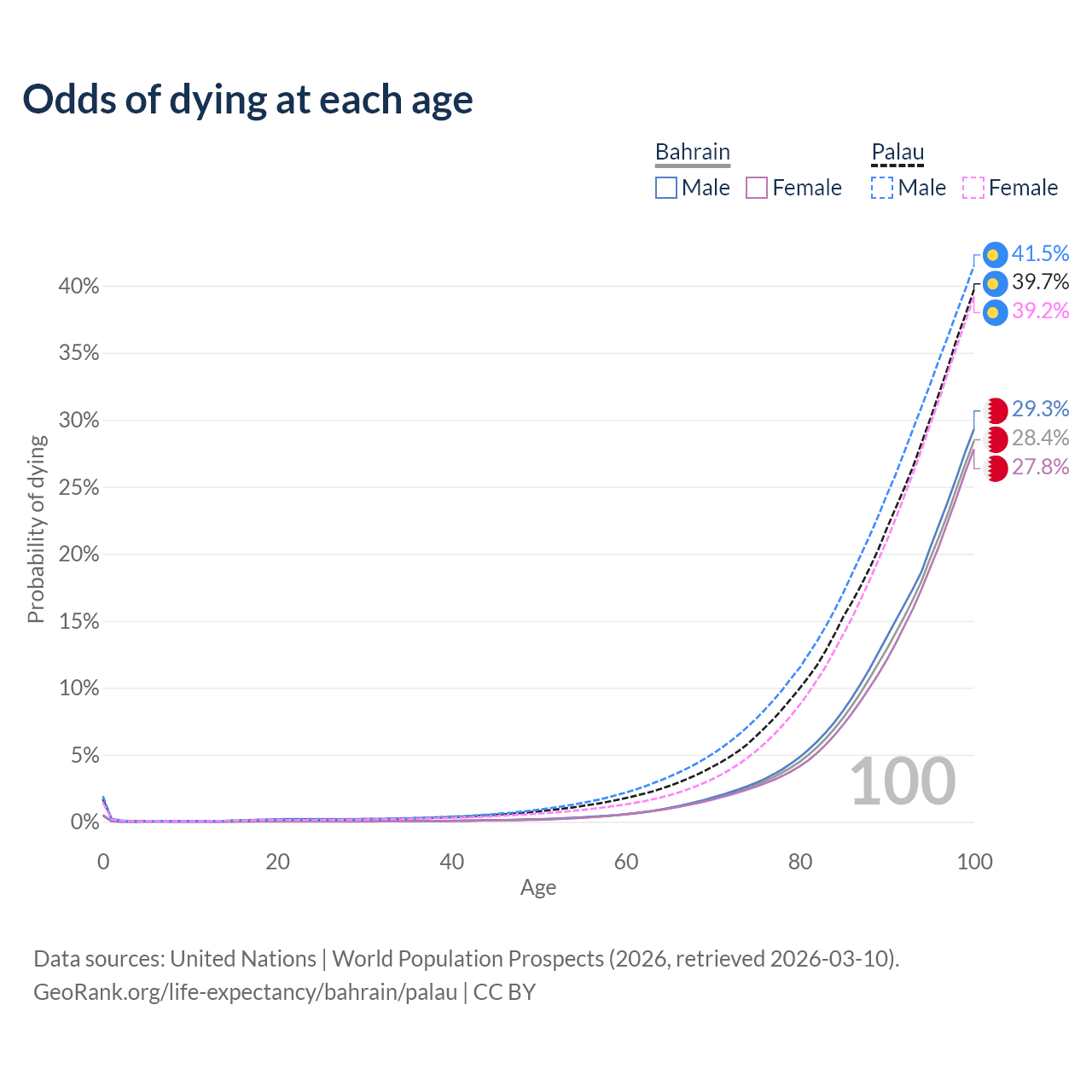 This life expectancy calculator shows the odds of living to 100, 95, 90, and below based on current age for both males and females in Bahrain and Palau, along with mean and median age of death. The calculations are based on the 2026 life tables (actuarial tables) from the UN World Population Prospects.