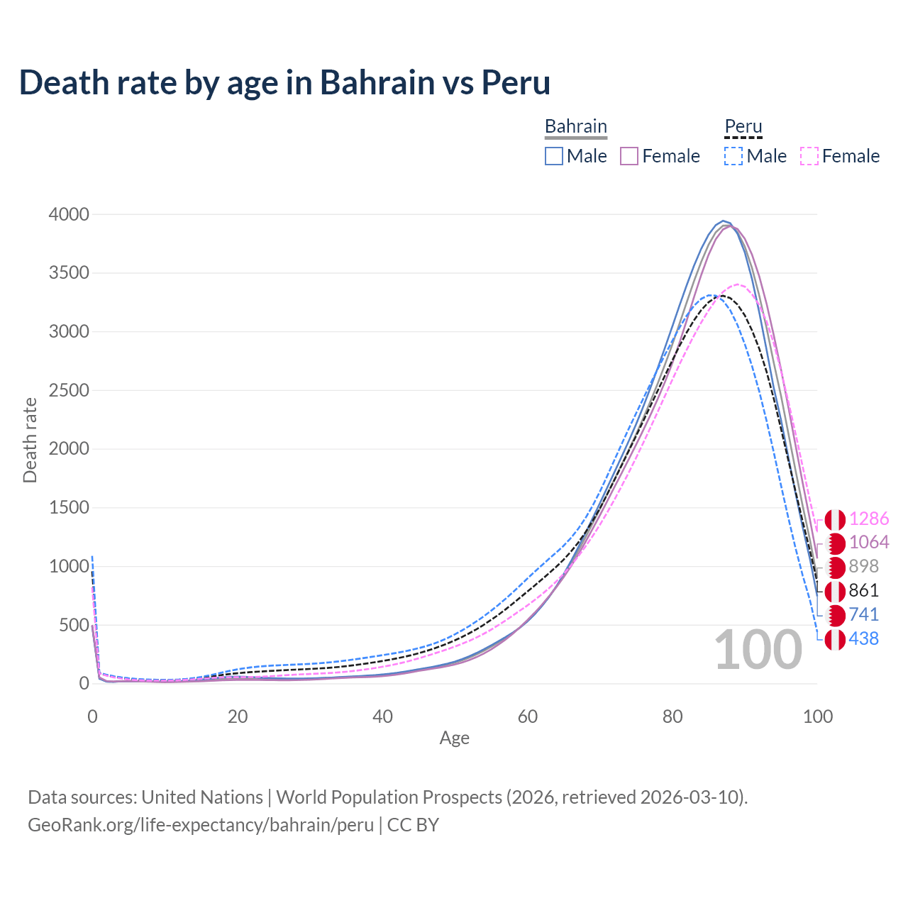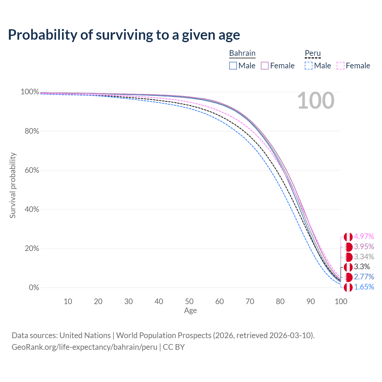 This life expectancy calculator shows the odds of living to 100, 95, 90, and below based on current age for both males and females in Bahrain and Peru, along with mean and median age of death. The calculations are based on the 2026 life tables (actuarial tables) from the UN World Population Prospects.
