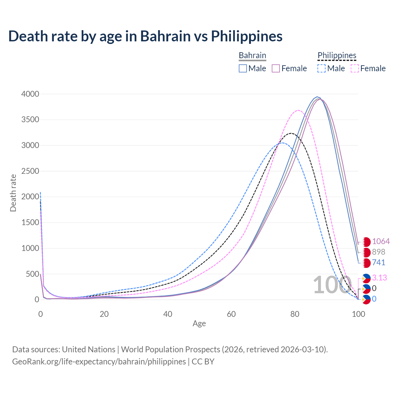 This life expectancy calculator shows the odds of living to 100, 95, 90, and below based on current age for both males and females in Bahrain and the Philippines, along with mean and median age of death. The calculations are based on the 2026 life tables (actuarial tables) from the UN World Population Prospects.