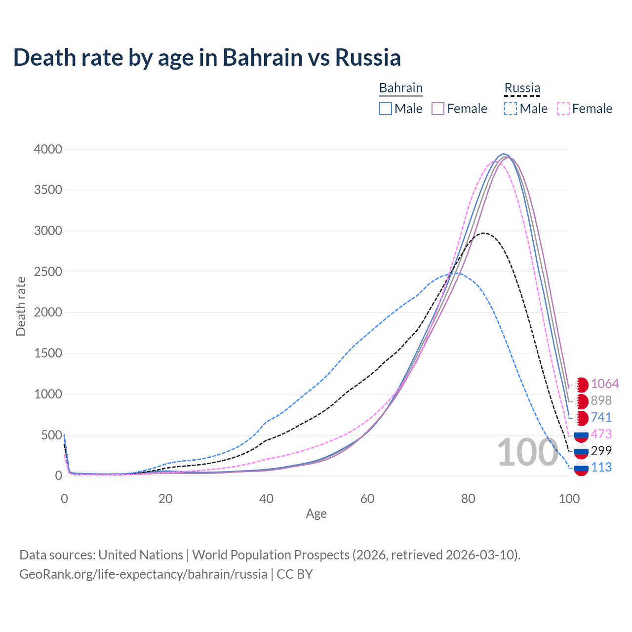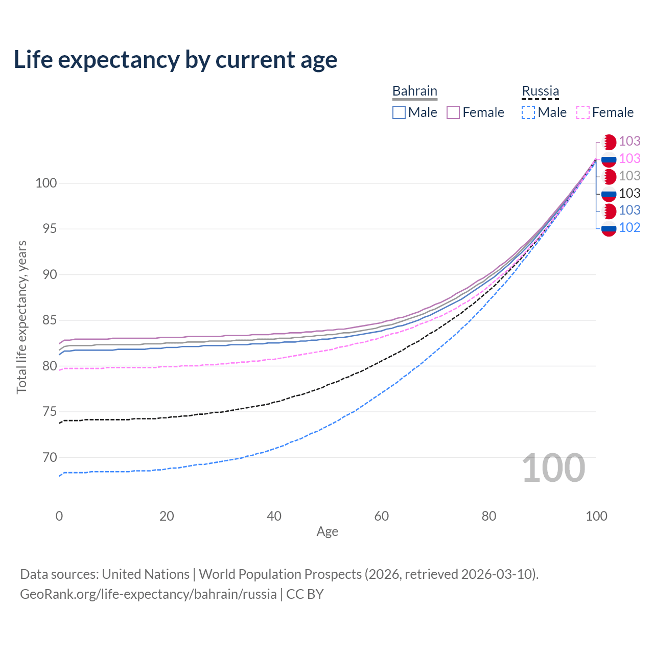 This life expectancy calculator shows the odds of living to 100, 95, 90, and below based on current age for both males and females in Bahrain and Russia, along with mean and median age of death. The calculations are based on the 2026 life tables (actuarial tables) from the UN World Population Prospects.