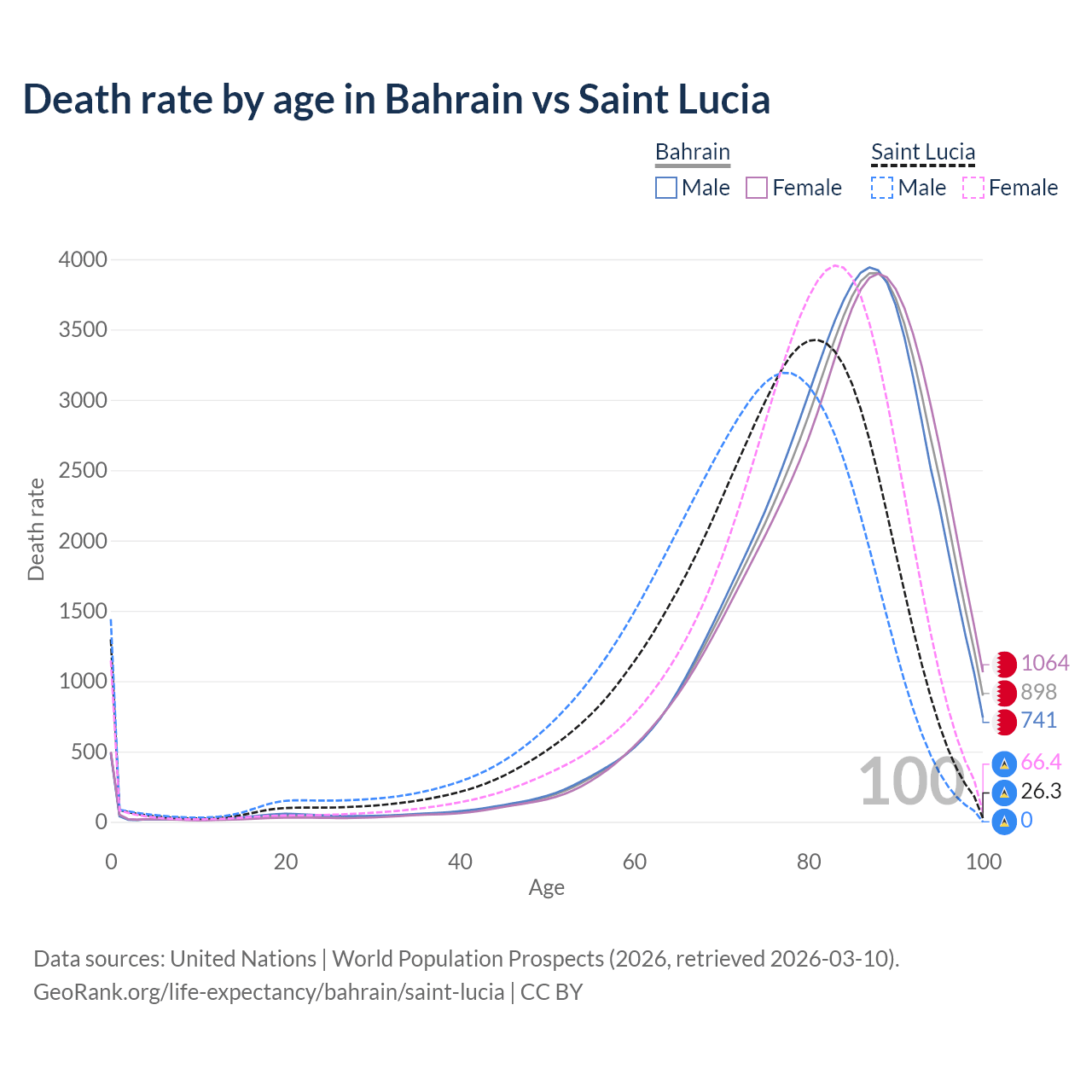 In Bahrain, the most common age of death is 88, compared to 81 in Saint Lucia. The median age of death is 84.4 in Bahrain and 76.8 in Saint Lucia, meaning only half of each cohort is expected to live past that age.