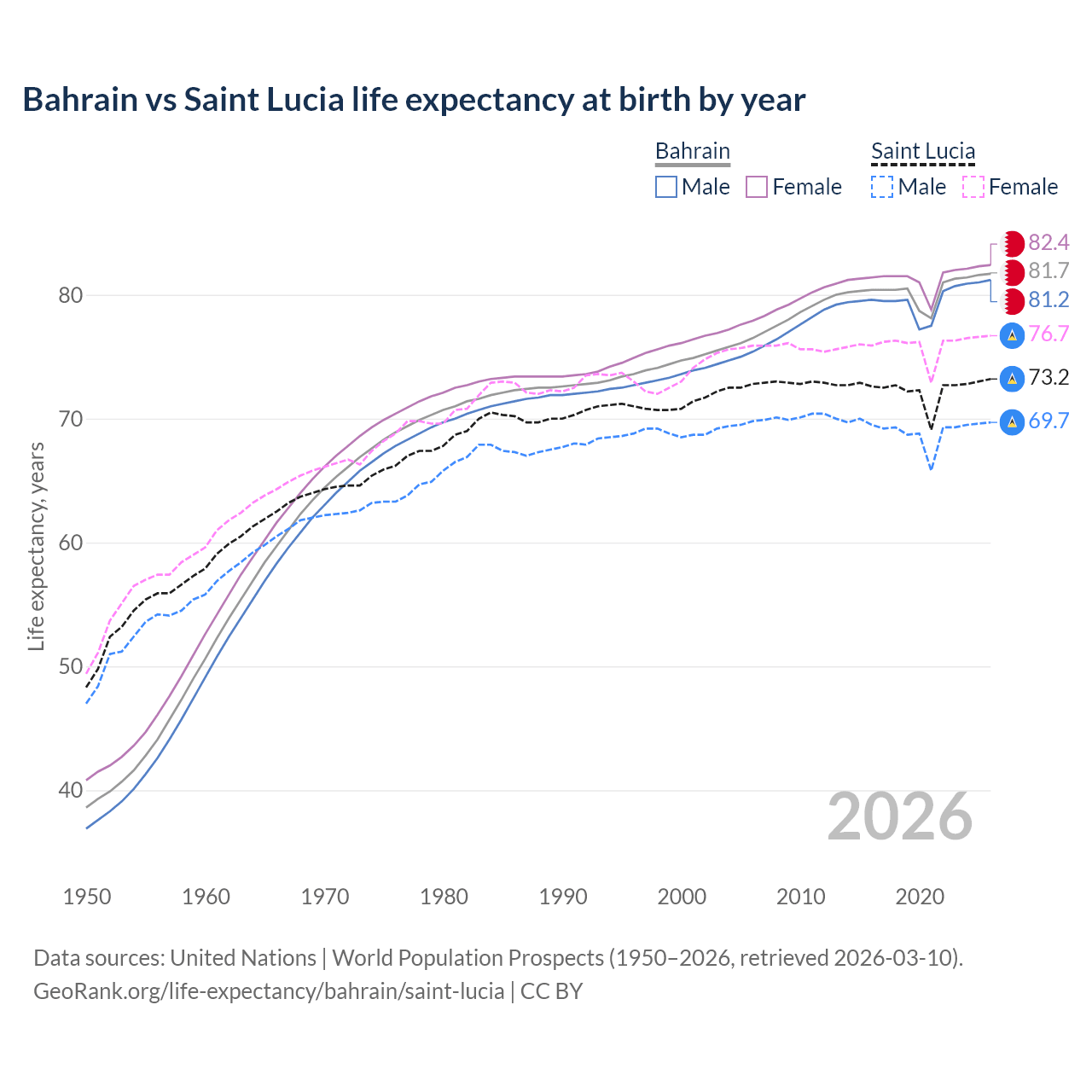 GeoRank.org/life-expectancy/bahrain/saint-lucia | CC BY