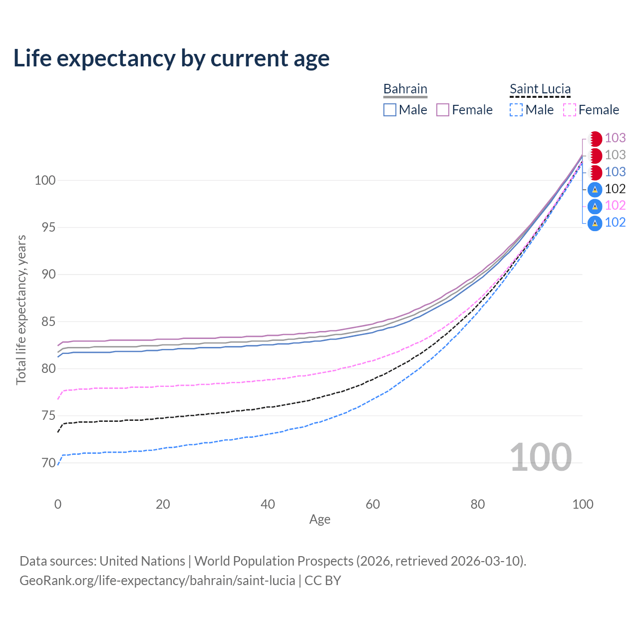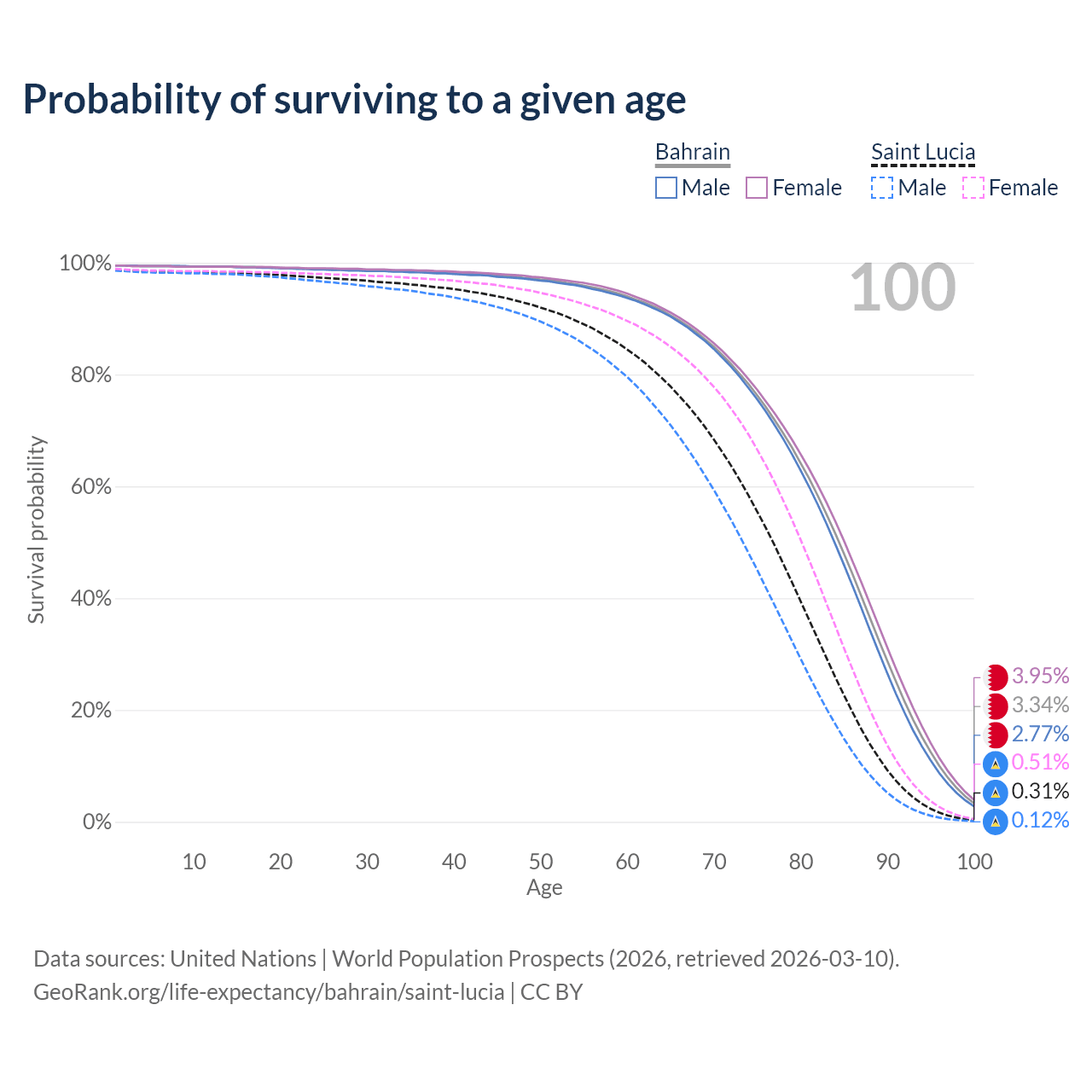 This life expectancy calculator shows the odds of living to 100, 95, 90, and below based on current age for both males and females in Bahrain and Saint Lucia, along with mean and median age of death. The calculations are based on the 2026 life tables (actuarial tables) from the UN World Population Prospects.