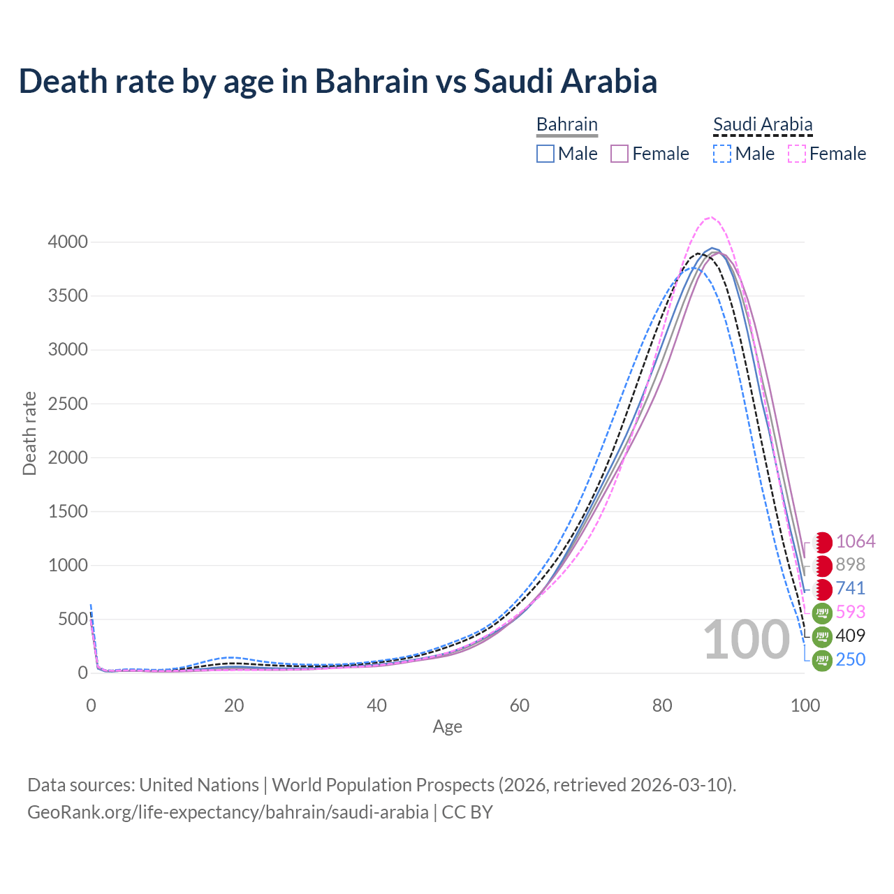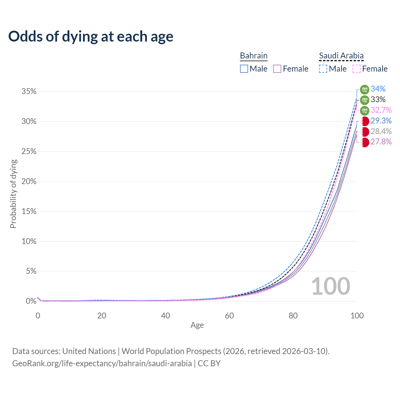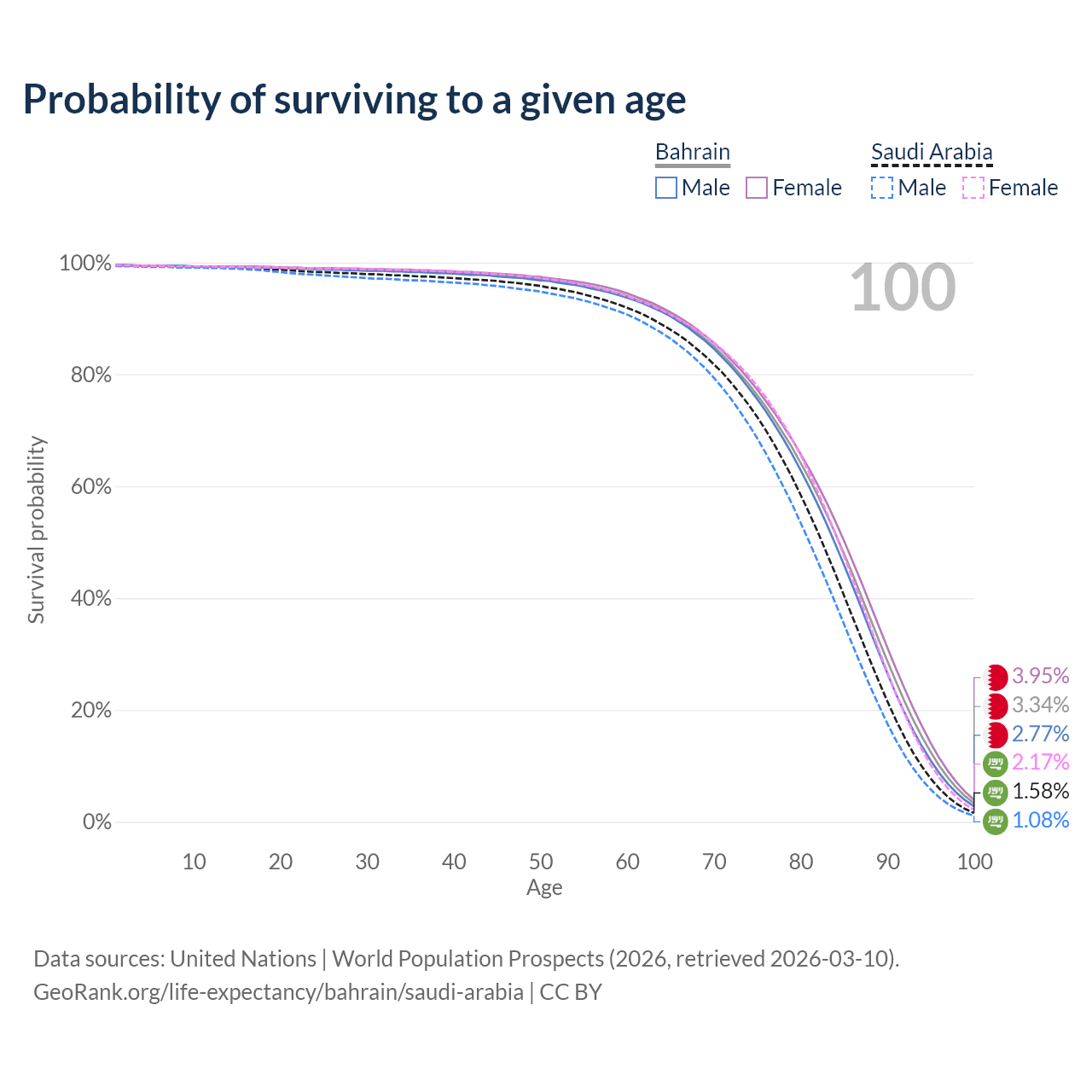 This life expectancy calculator shows the odds of living to 100, 95, 90, and below based on current age for both males and females in Bahrain and Saudi Arabia, along with mean and median age of death. The calculations are based on the 2026 life tables (actuarial tables) from the UN World Population Prospects.