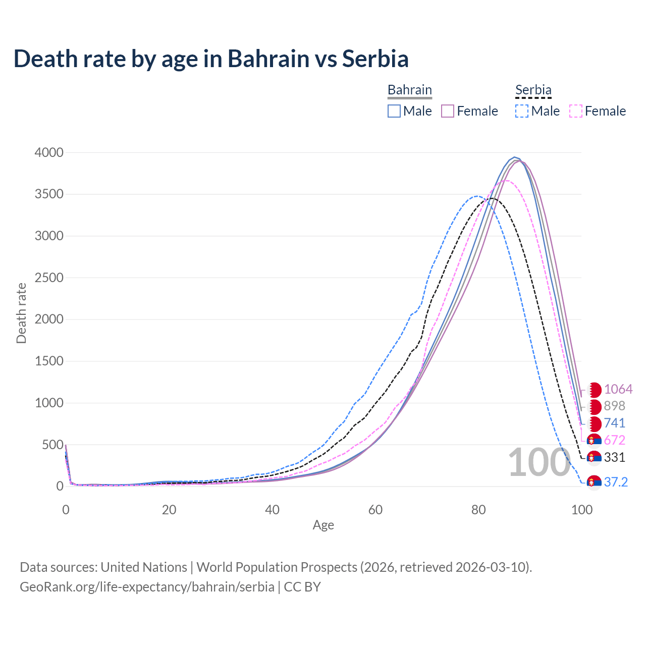 This life expectancy calculator shows the odds of living to 100, 95, 90, and below based on current age for both males and females in Bahrain and Serbia, along with mean and median age of death. The calculations are based on the 2026 life tables (actuarial tables) from the UN World Population Prospects.