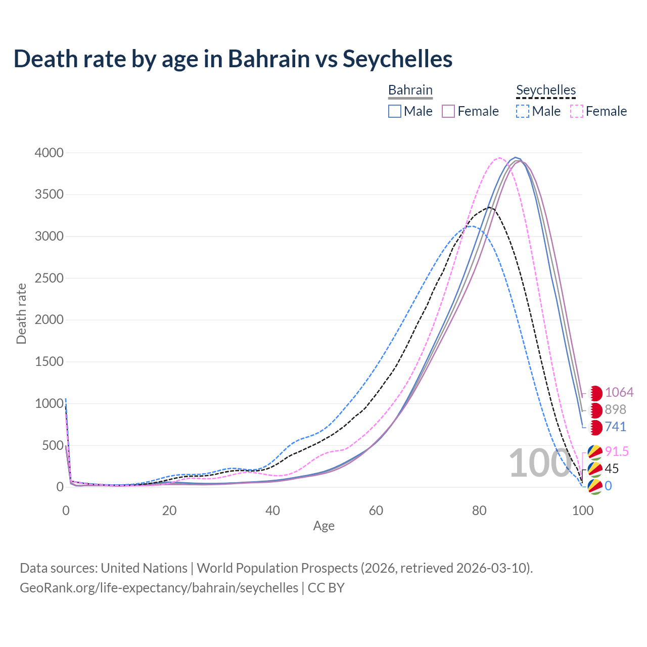 This life expectancy calculator shows the odds of living to 100, 95, 90, and below based on current age for both males and females in Bahrain and the Seychelles, along with mean and median age of death. The calculations are based on the 2026 life tables (actuarial tables) from the UN World Population Prospects.