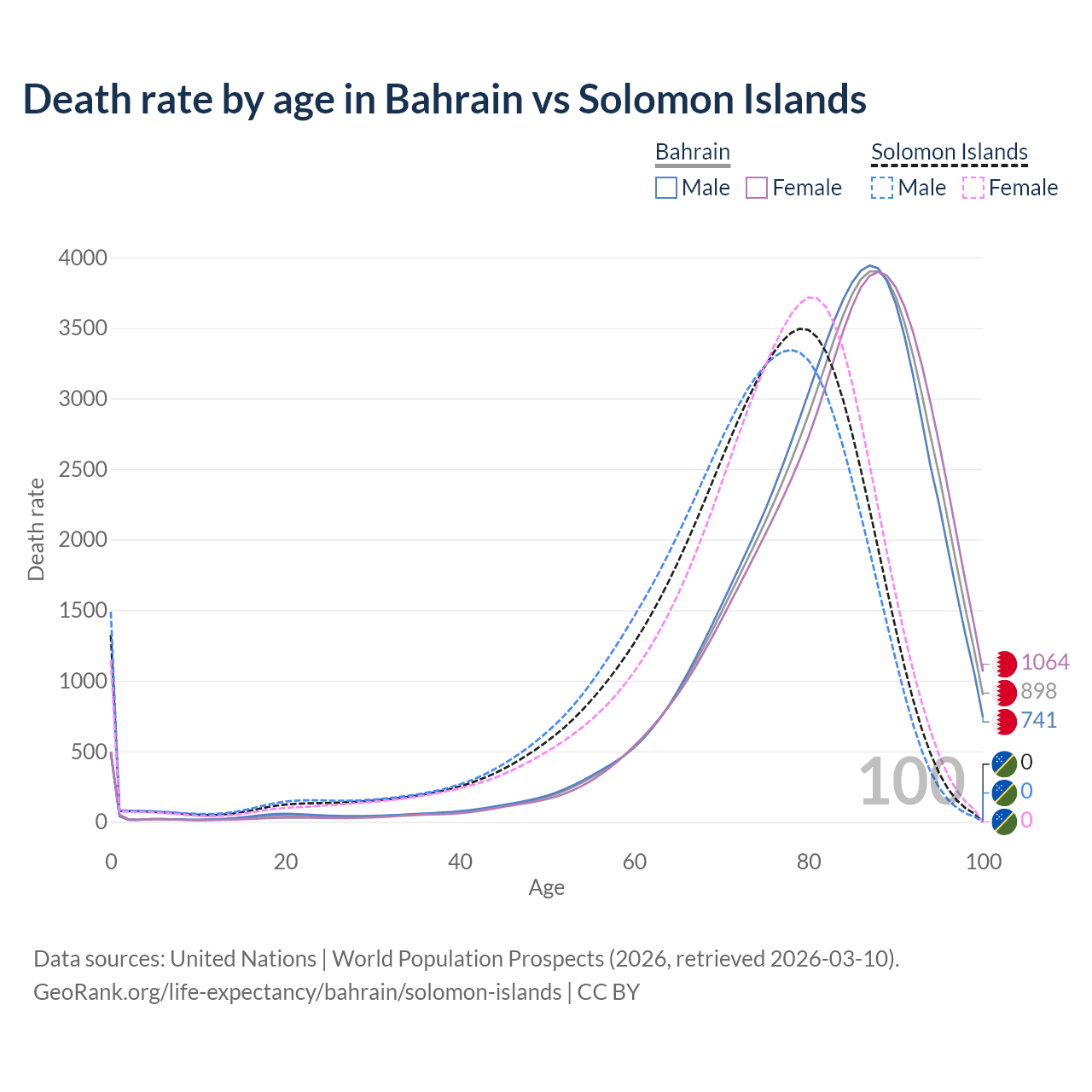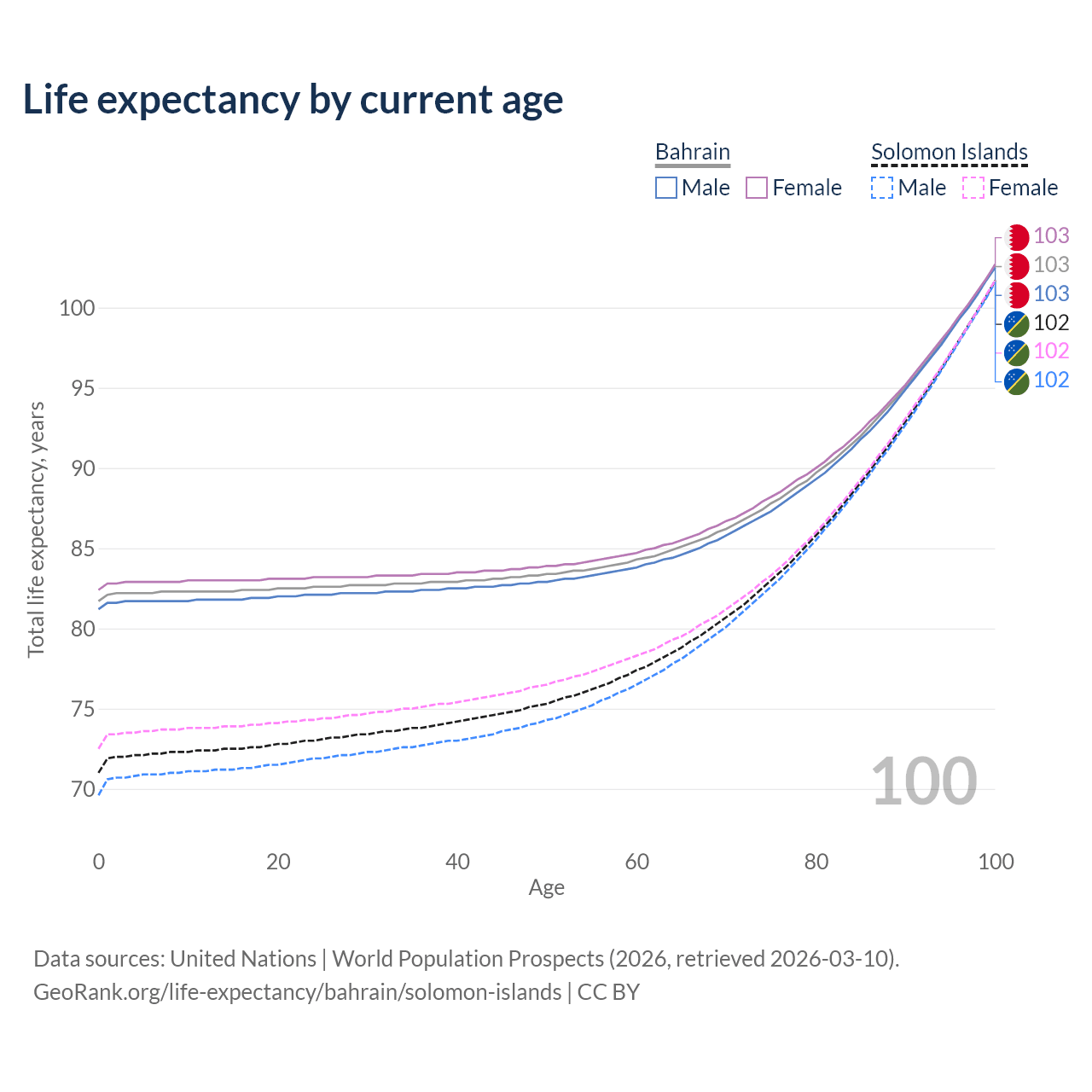 This life expectancy calculator shows the odds of living to 100, 95, 90, and below based on current age for both males and females in Bahrain and the Solomon Islands, along with mean and median age of death. The calculations are based on the 2026 life tables (actuarial tables) from the UN World Population Prospects.