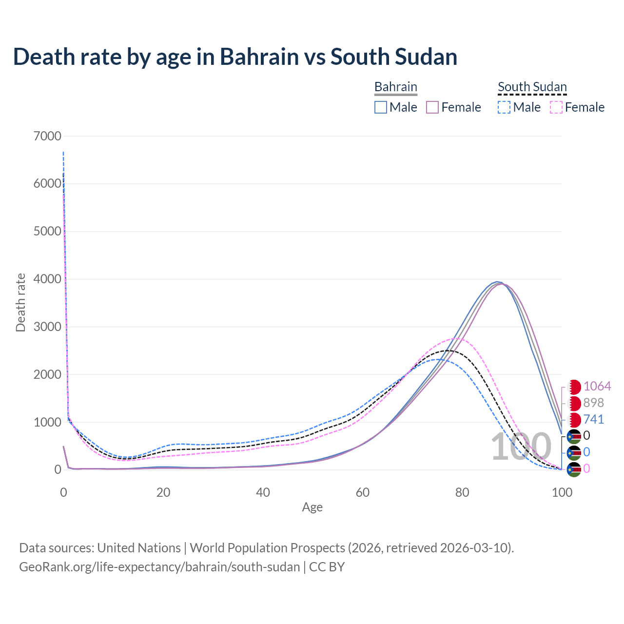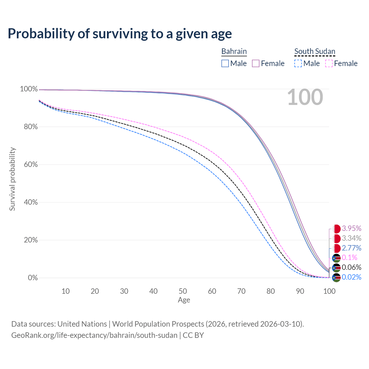 This life expectancy calculator shows the odds of living to 100, 95, 90, and below based on current age for both males and females in Bahrain and South Sudan, along with mean and median age of death. The calculations are based on the 2026 life tables (actuarial tables) from the UN World Population Prospects.
