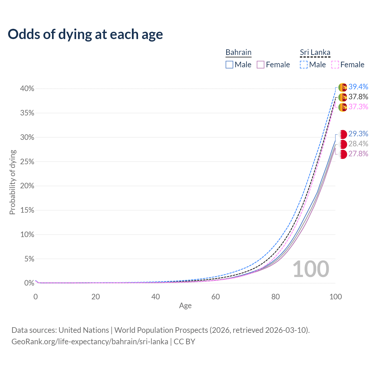 This life expectancy calculator shows the odds of living to 100, 95, 90, and below based on current age for both males and females in Bahrain and Sri Lanka, along with mean and median age of death. The calculations are based on the 2026 life tables (actuarial tables) from the UN World Population Prospects.