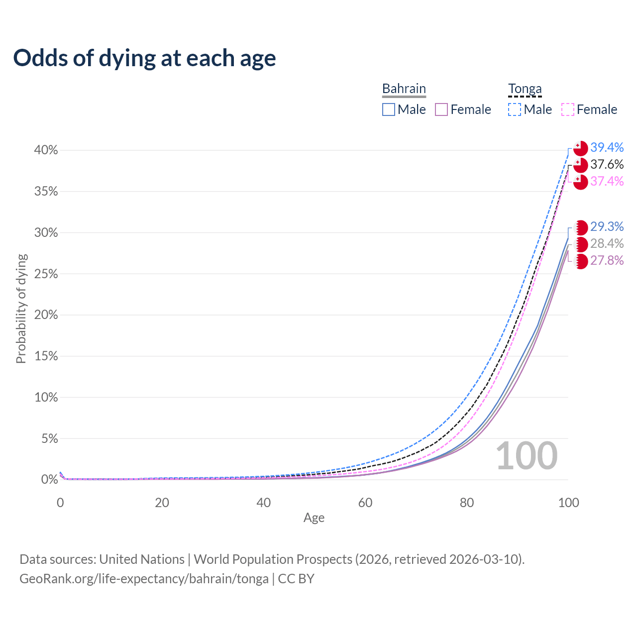 This life expectancy calculator shows the odds of living to 100, 95, 90, and below based on current age for both males and females in Bahrain and Tonga, along with mean and median age of death. The calculations are based on the 2026 life tables (actuarial tables) from the UN World Population Prospects.