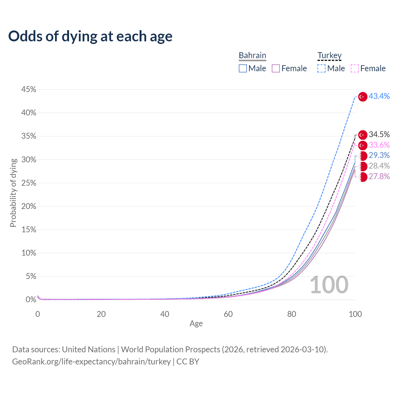 This life expectancy calculator shows the odds of living to 100, 95, 90, and below based on current age for both males and females in Bahrain and Turkey, along with mean and median age of death. The calculations are based on the 2026 life tables (actuarial tables) from the UN World Population Prospects.