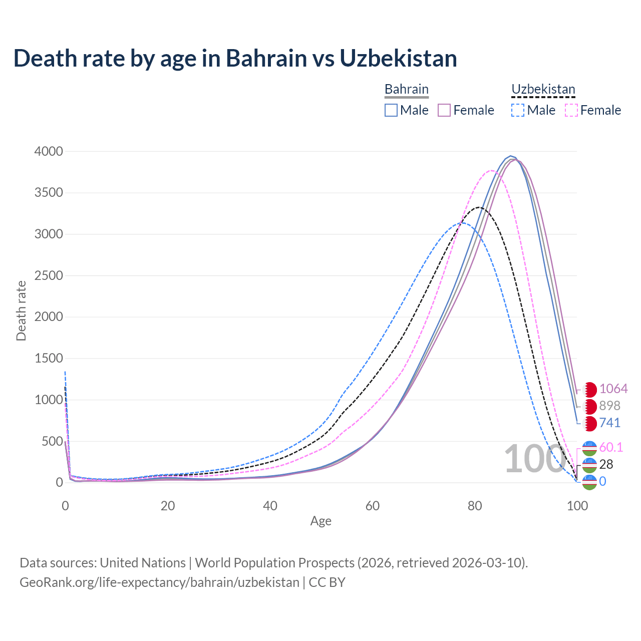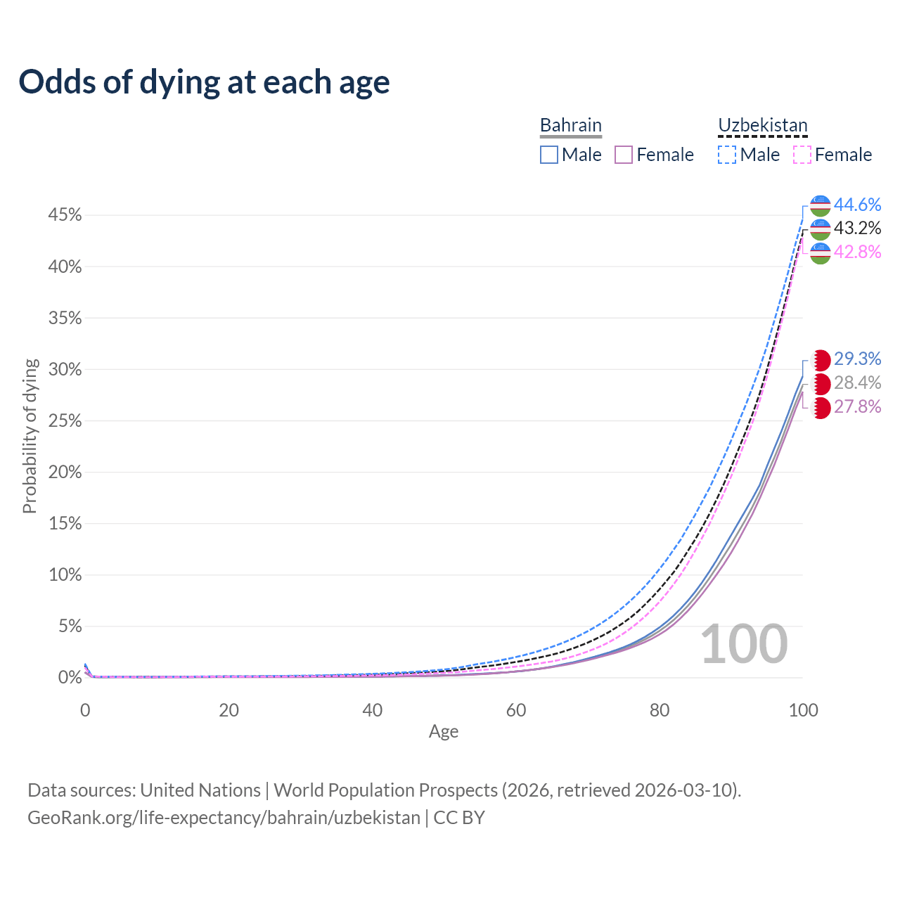 This life expectancy calculator shows the odds of living to 100, 95, 90, and below based on current age for both males and females in Bahrain and Uzbekistan, along with mean and median age of death. The calculations are based on the 2026 life tables (actuarial tables) from the UN World Population Prospects.