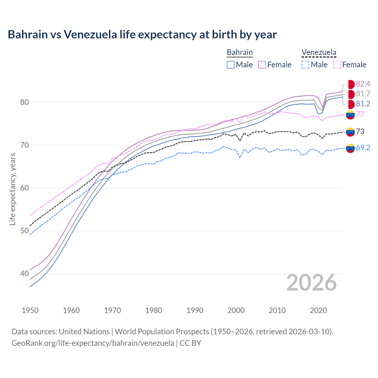 The average life expectancy at birth is 81.7 years in Bahrain vs 73 in Venezuela. Bahrain is ranked 36/197 by life expectancy, and Venezuela is 114/197. In Bahrain, the life expectancy is 81.2 years for males and 82.4 years for females. In Venezuela, it's 69.2 years for males and 77 years for females.