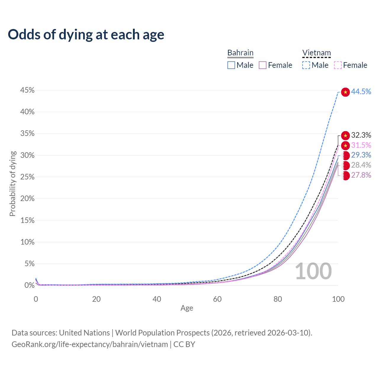 This life expectancy calculator shows the odds of living to 100, 95, 90, and below based on current age for both males and females in Bahrain and Vietnam, along with mean and median age of death. The calculations are based on the 2026 life tables (actuarial tables) from the UN World Population Prospects.