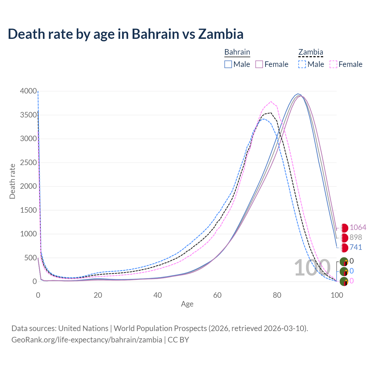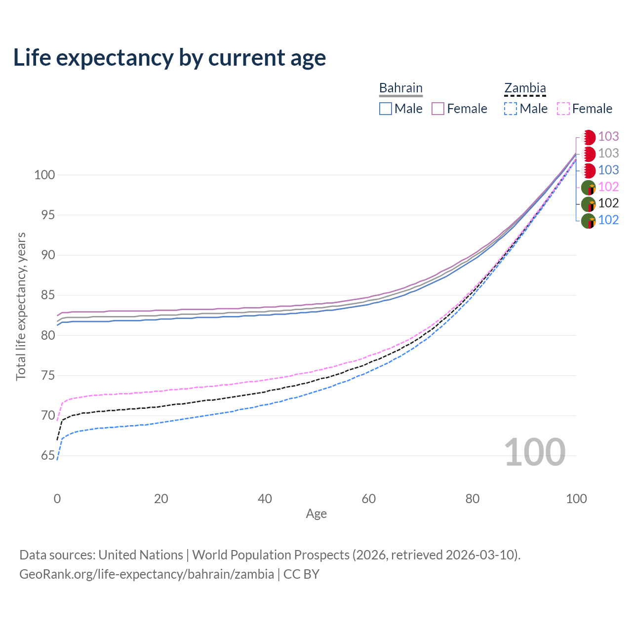 This life expectancy calculator shows the odds of living to 100, 95, 90, and below based on current age for both males and females in Bahrain and Zambia, along with mean and median age of death. The calculations are based on the 2026 life tables (actuarial tables) from the UN World Population Prospects.