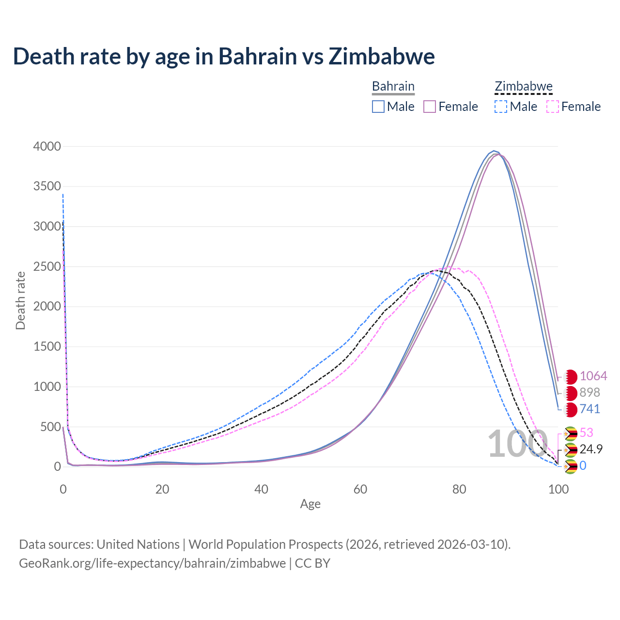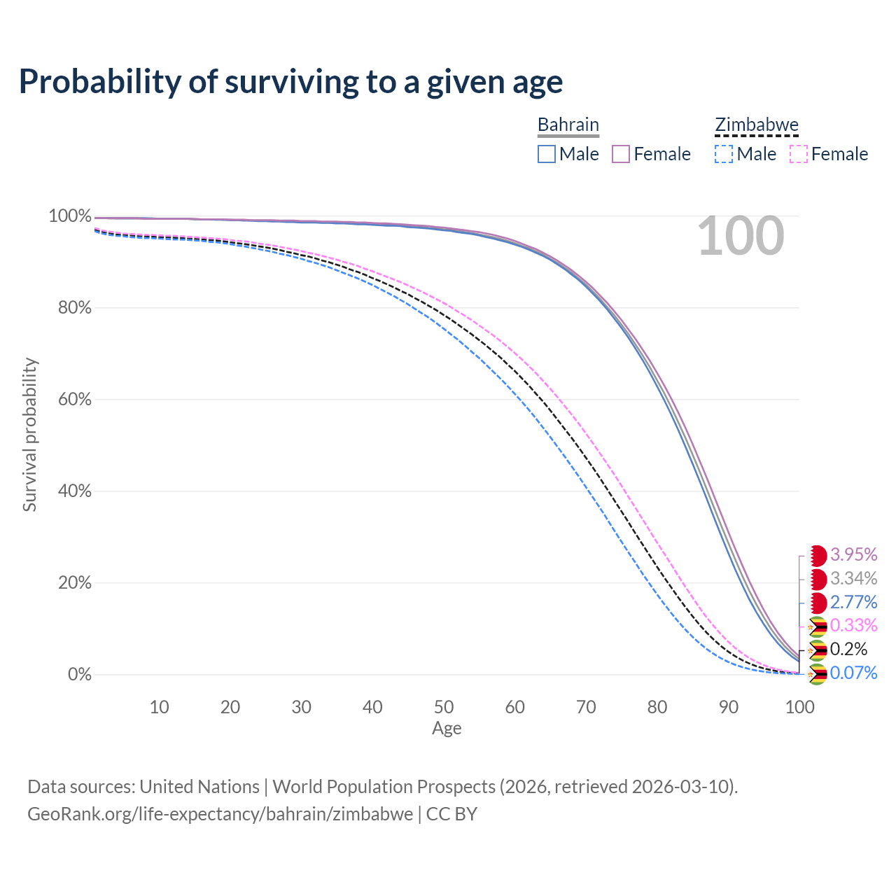 This life expectancy calculator shows the odds of living to 100, 95, 90, and below based on current age for both males and females in Bahrain and Zimbabwe, along with mean and median age of death. The calculations are based on the 2026 life tables (actuarial tables) from the UN World Population Prospects.