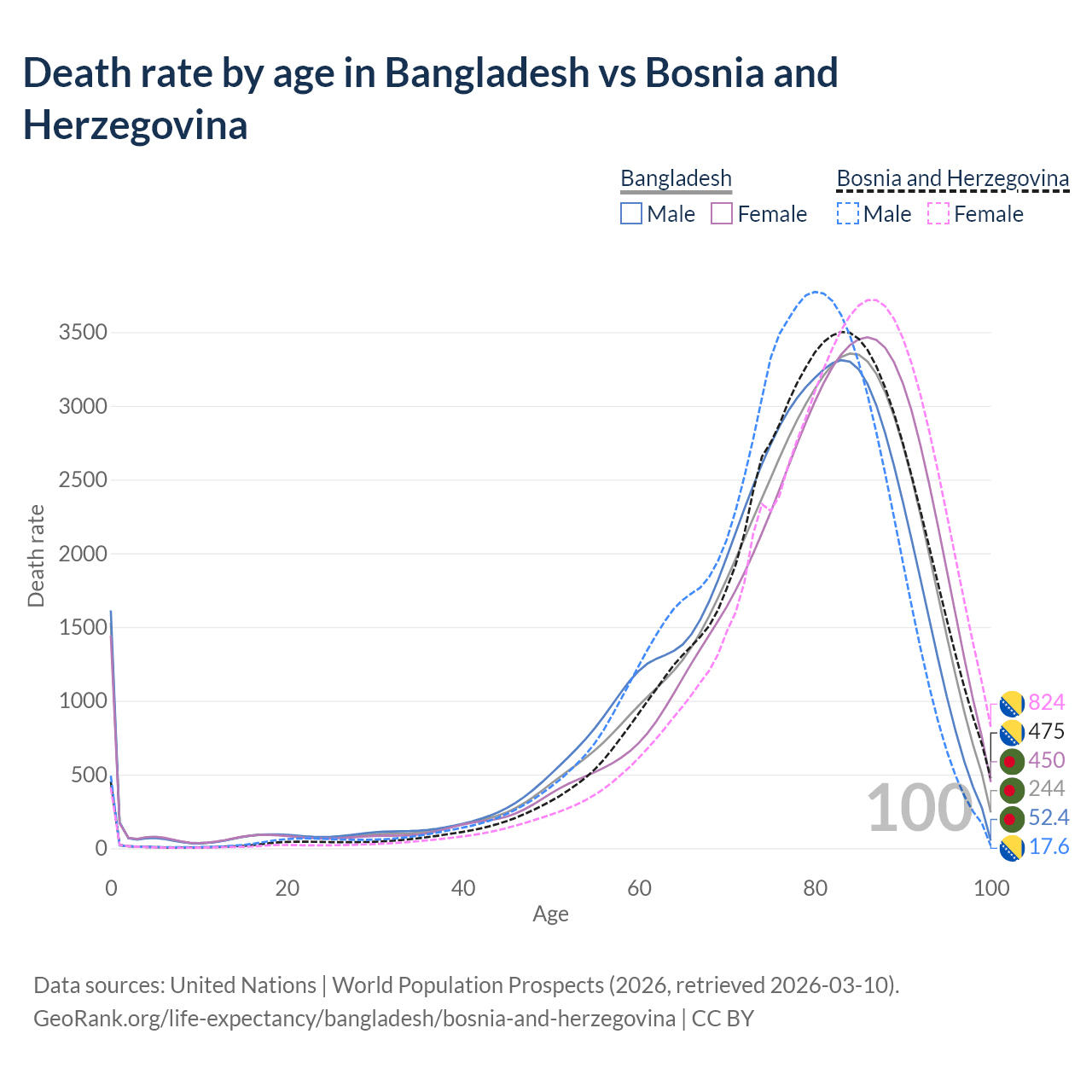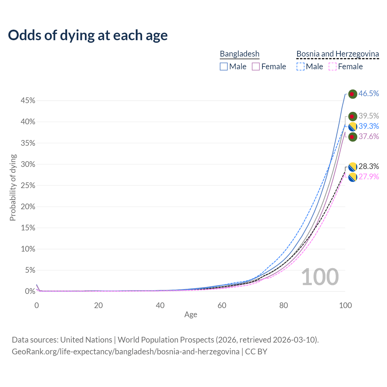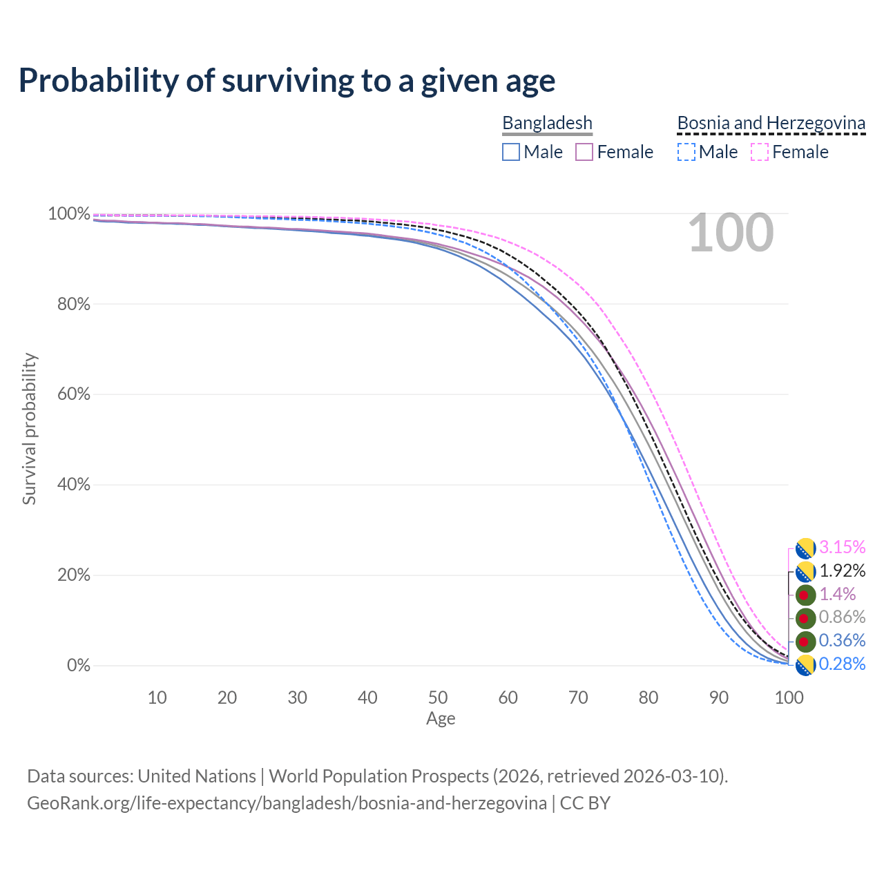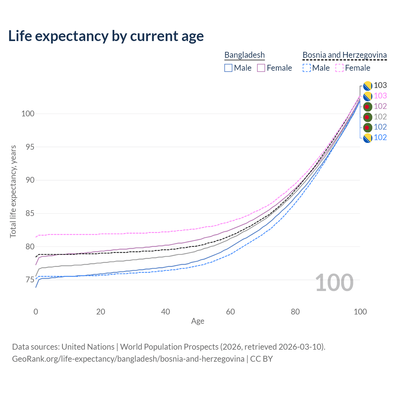 This life expectancy calculator shows the odds of living to 100, 95, 90, and below based on current age for both males and females in Bangladesh and Bosnia and Herzegovina, along with mean and median age of death. The calculations are based on the 2026 life tables (actuarial tables) from the UN World Population Prospects.