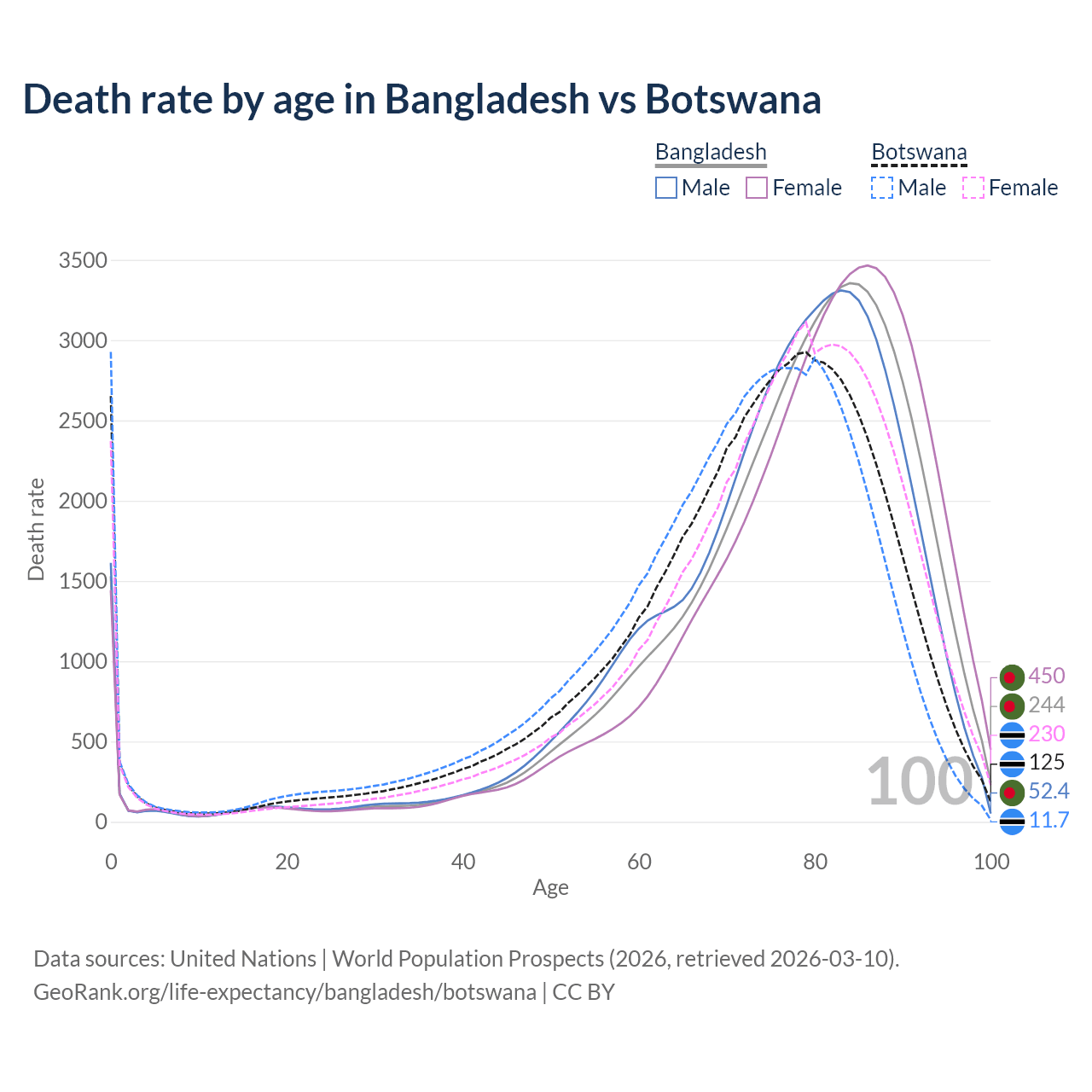 In Bangladesh, the most common age of death is 84, compared to 79 in Botswana. The median age of death is 79.7 in Bangladesh and 74.4 in Botswana, meaning only half of each cohort is expected to live past that age.