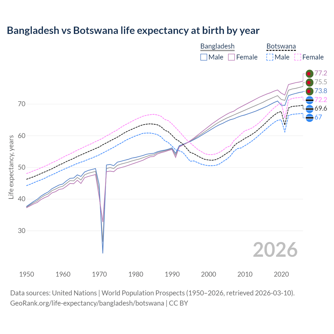 The average life expectancy at birth is 75.5 years in Bangladesh vs 69.6 in Botswana. Bangladesh is ranked 89/197 by life expectancy, and Botswana is 141/197. In Bangladesh, the life expectancy is 73.8 years for males and 77.2 years for females. In Botswana, it's 67 years for males and 72.2 years for females.