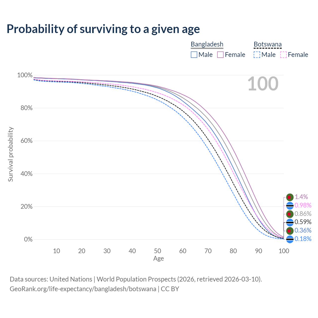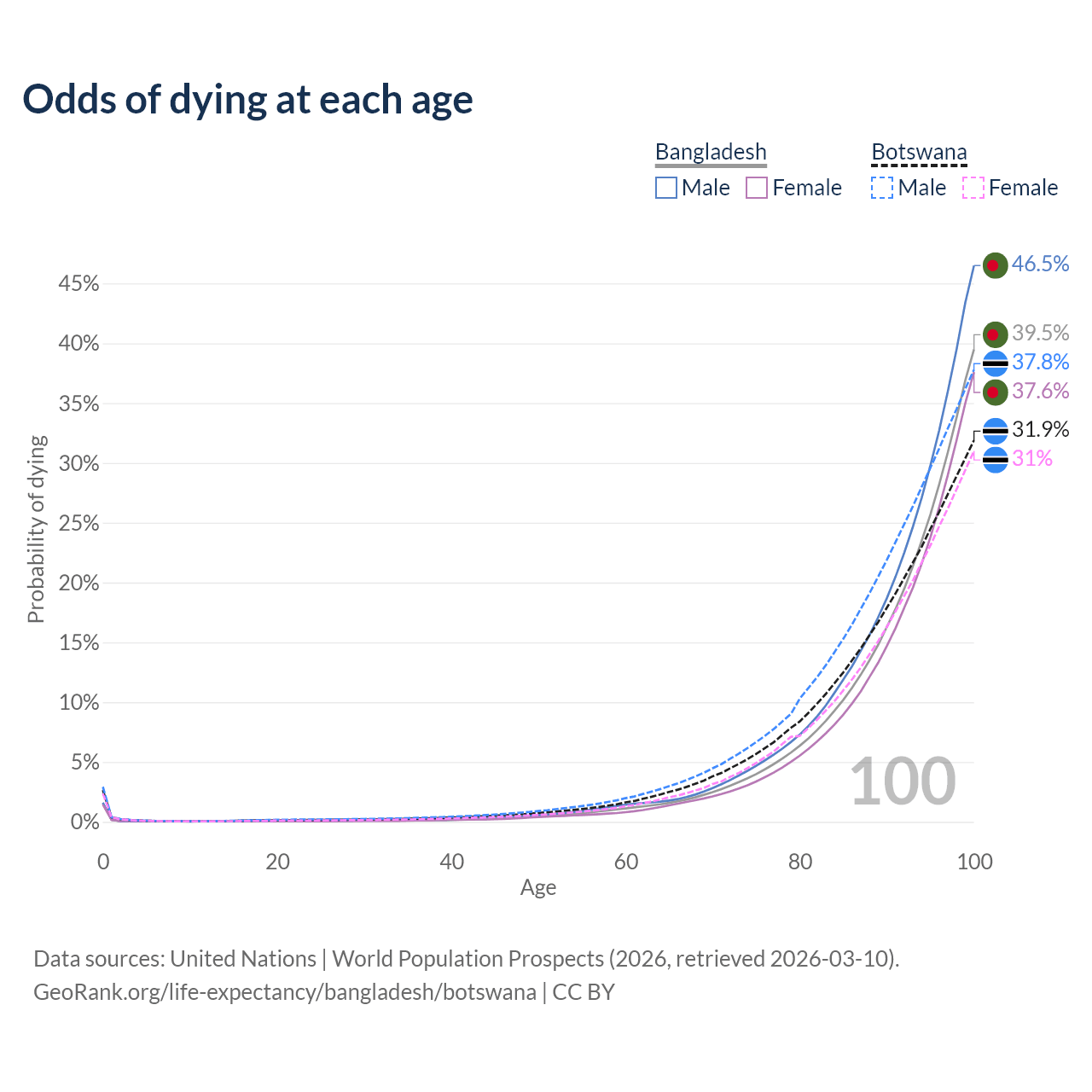 This life expectancy calculator shows the odds of living to 100, 95, 90, and below based on current age for both males and females in Bangladesh and Botswana, along with mean and median age of death. The calculations are based on the 2026 life tables (actuarial tables) from the UN World Population Prospects.