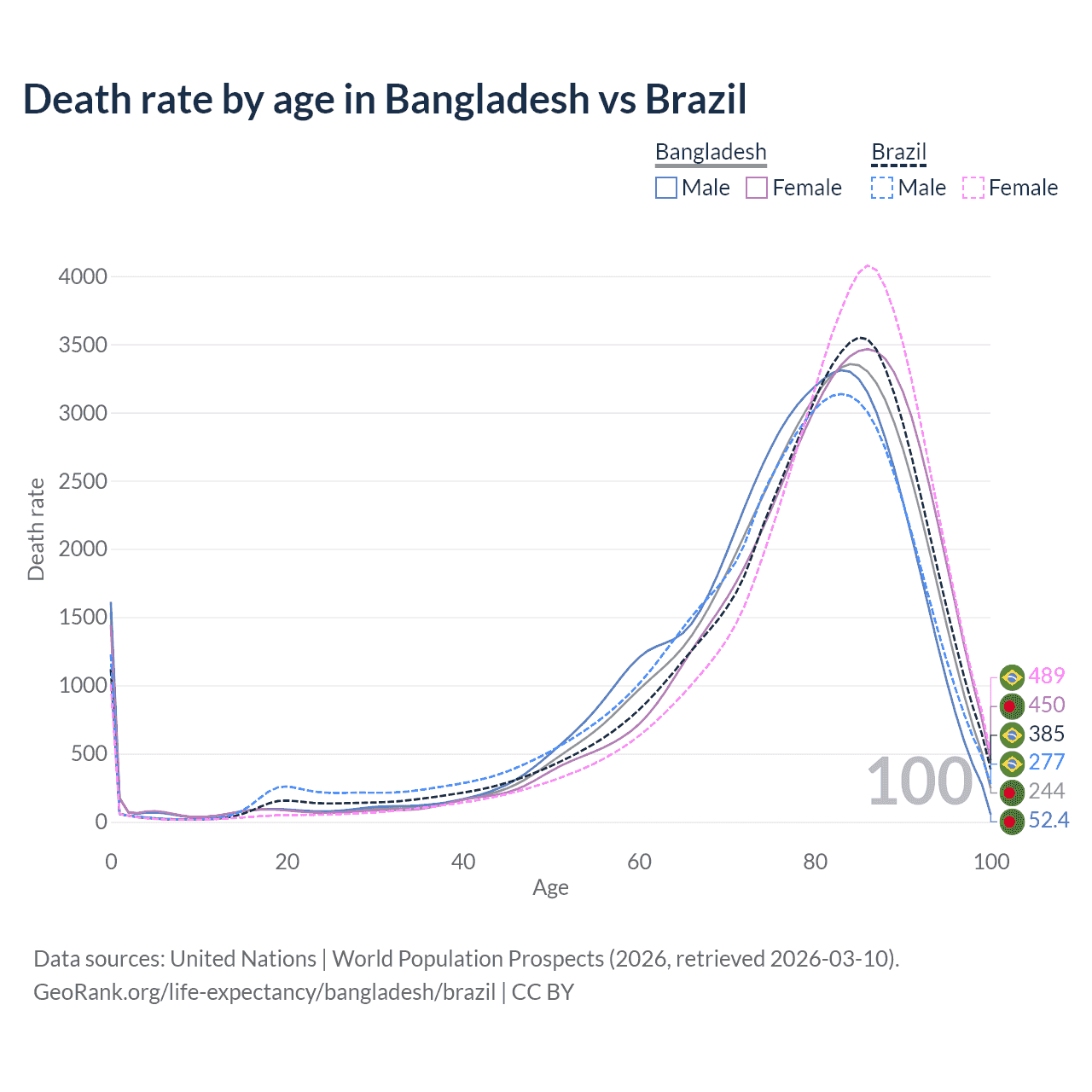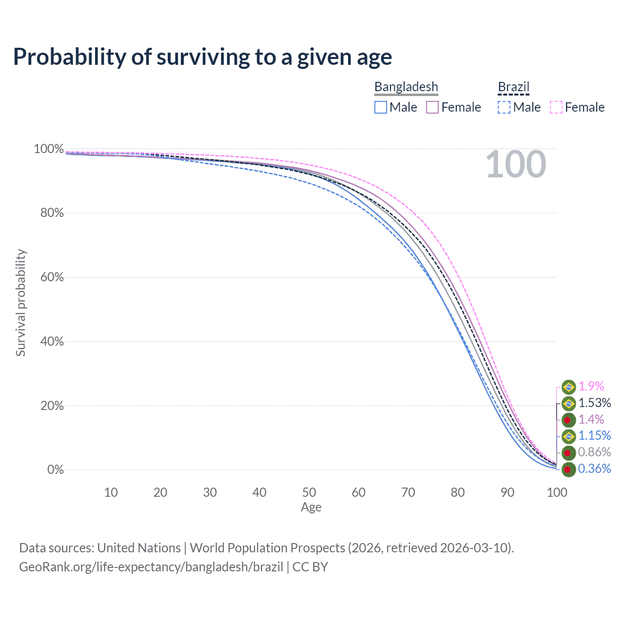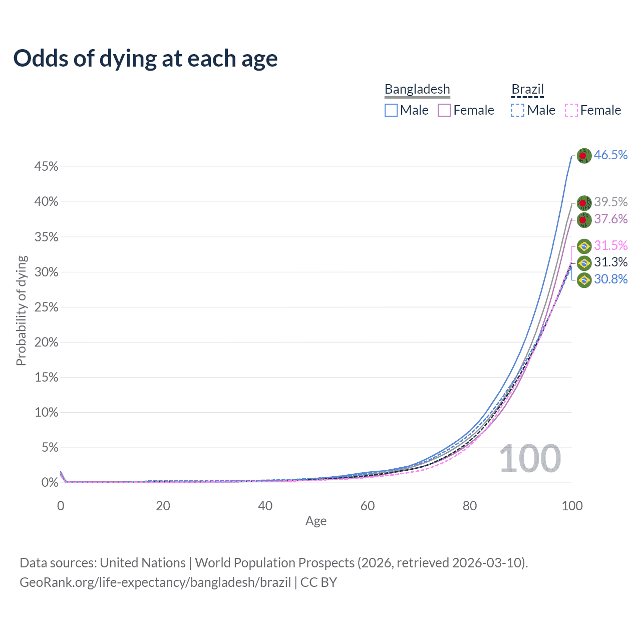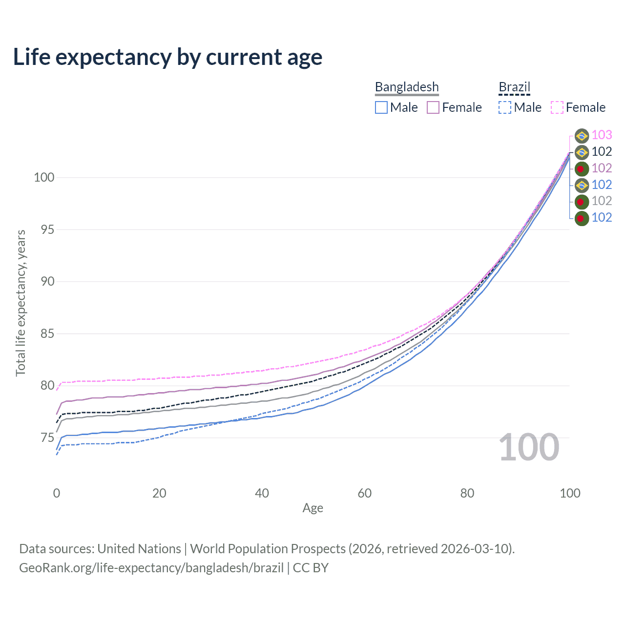 This life expectancy calculator shows the odds of living to 100, 95, 90, and below based on current age for both males and females in Bangladesh and Brazil, along with mean and median age of death. The calculations are based on the 2026 life tables (actuarial tables) from the UN World Population Prospects.
