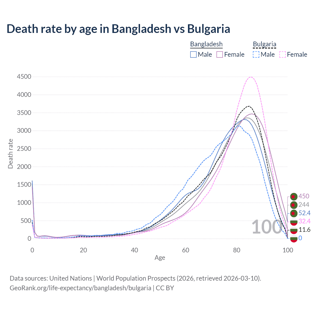 In Bangladesh, the most common age of death is 84, compared to 85 in Bulgaria. The median age of death is 79.7 in Bangladesh and 79.5 in Bulgaria, meaning only half of each cohort is expected to live past that age.