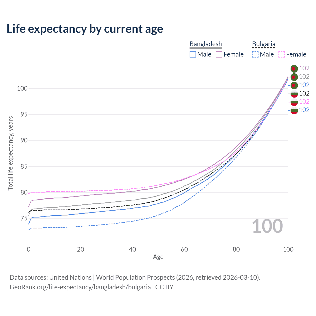 This life expectancy calculator shows the odds of living to 100, 95, 90, and below based on current age for both males and females in Bangladesh and Bulgaria, along with mean and median age of death. The calculations are based on the 2026 life tables (actuarial tables) from the UN World Population Prospects.