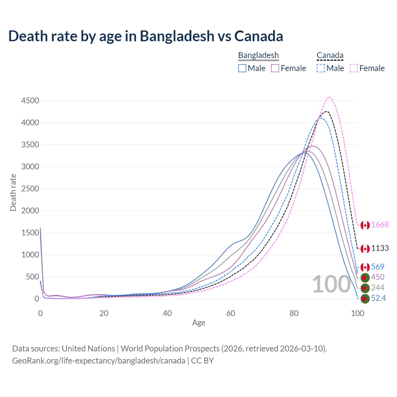 In Bangladesh, the most common age of death is 84, compared to 90 in Canada. The median age of death is 79.7 in Bangladesh and 86.4 in Canada, meaning only half of each cohort is expected to live past that age.