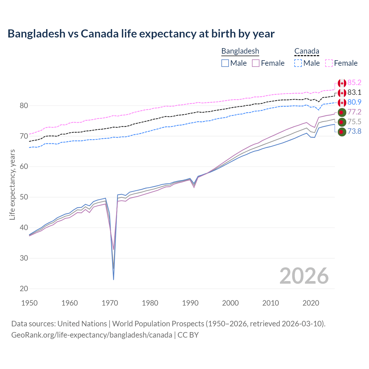 The average life expectancy at birth is 75.5 years in Bangladesh vs 83.1 in Canada. Bangladesh is ranked 89/197 by life expectancy, and Canada is 19/197. In Bangladesh, the life expectancy is 73.8 years for males and 77.2 years for females. In Canada, it's 80.9 years for males and 85.2 years for females.