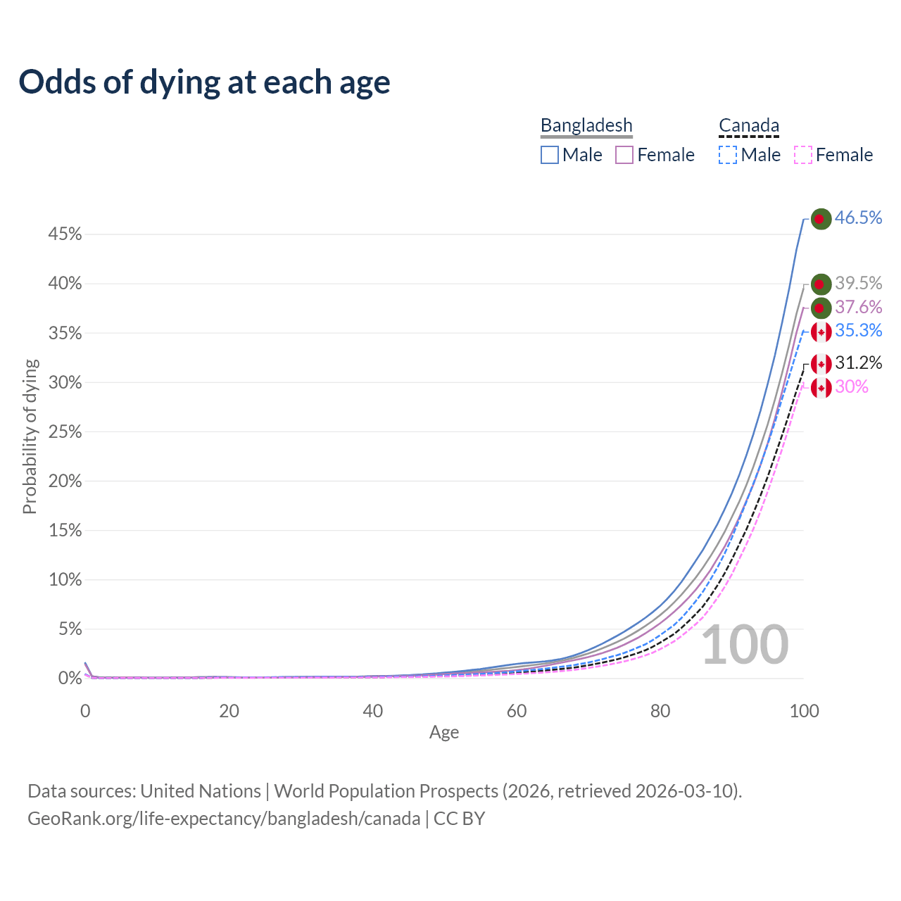 This life expectancy calculator shows the odds of living to 100, 95, 90, and below based on current age for both males and females in Bangladesh and Canada, along with mean and median age of death. The calculations are based on the 2026 life tables (actuarial tables) from the UN World Population Prospects.