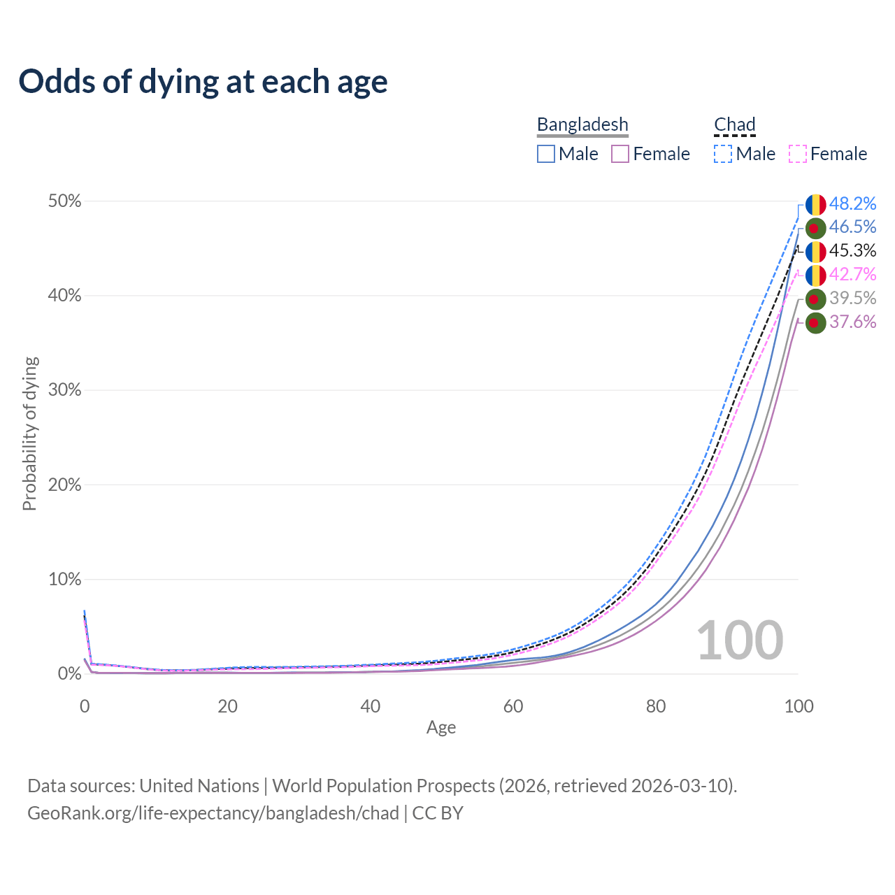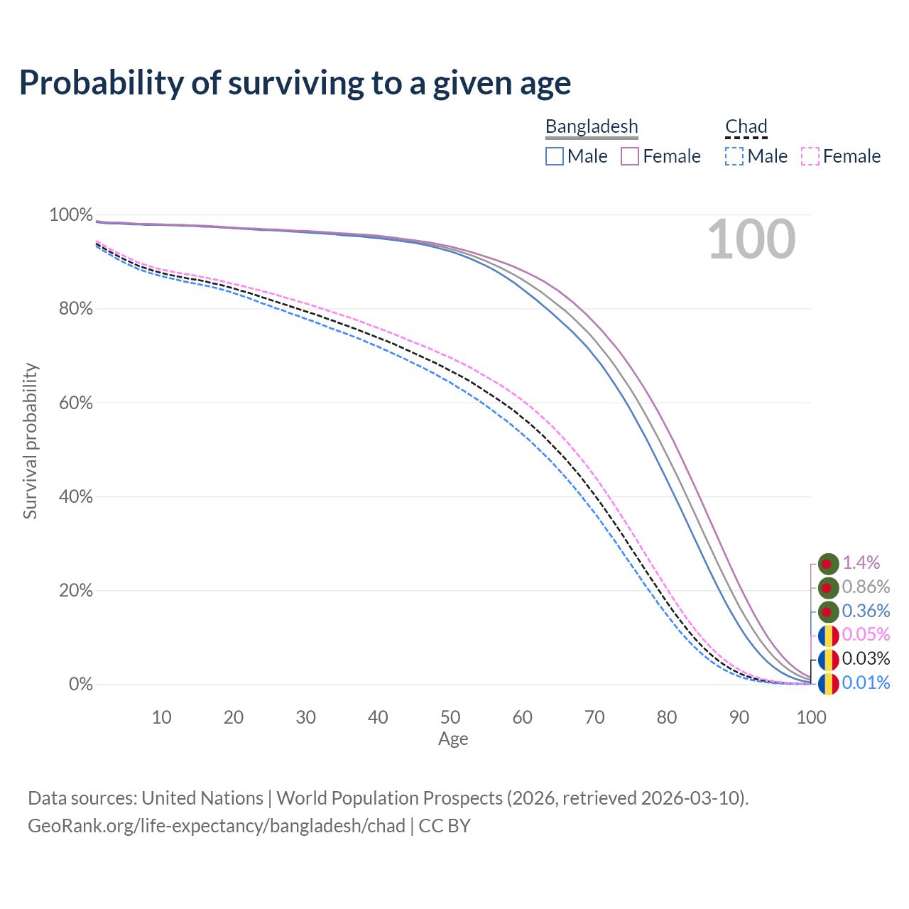 This life expectancy calculator shows the odds of living to 100, 95, 90, and below based on current age for both males and females in Bangladesh and Chad, along with mean and median age of death. The calculations are based on the 2026 life tables (actuarial tables) from the UN World Population Prospects.