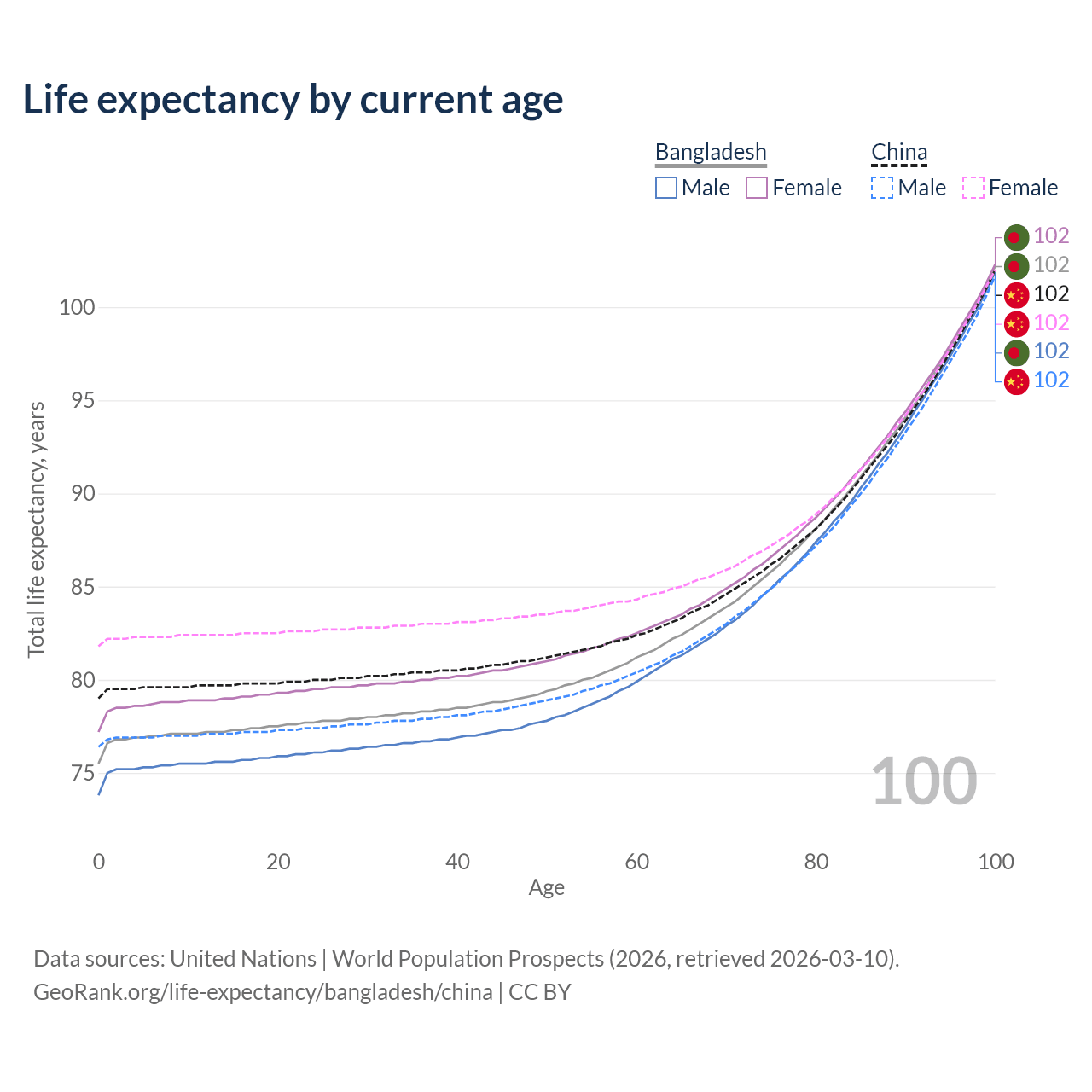 This life expectancy calculator shows the odds of living to 100, 95, 90, and below based on current age for both males and females in Bangladesh and China, along with mean and median age of death. The calculations are based on the 2026 life tables (actuarial tables) from the UN World Population Prospects.