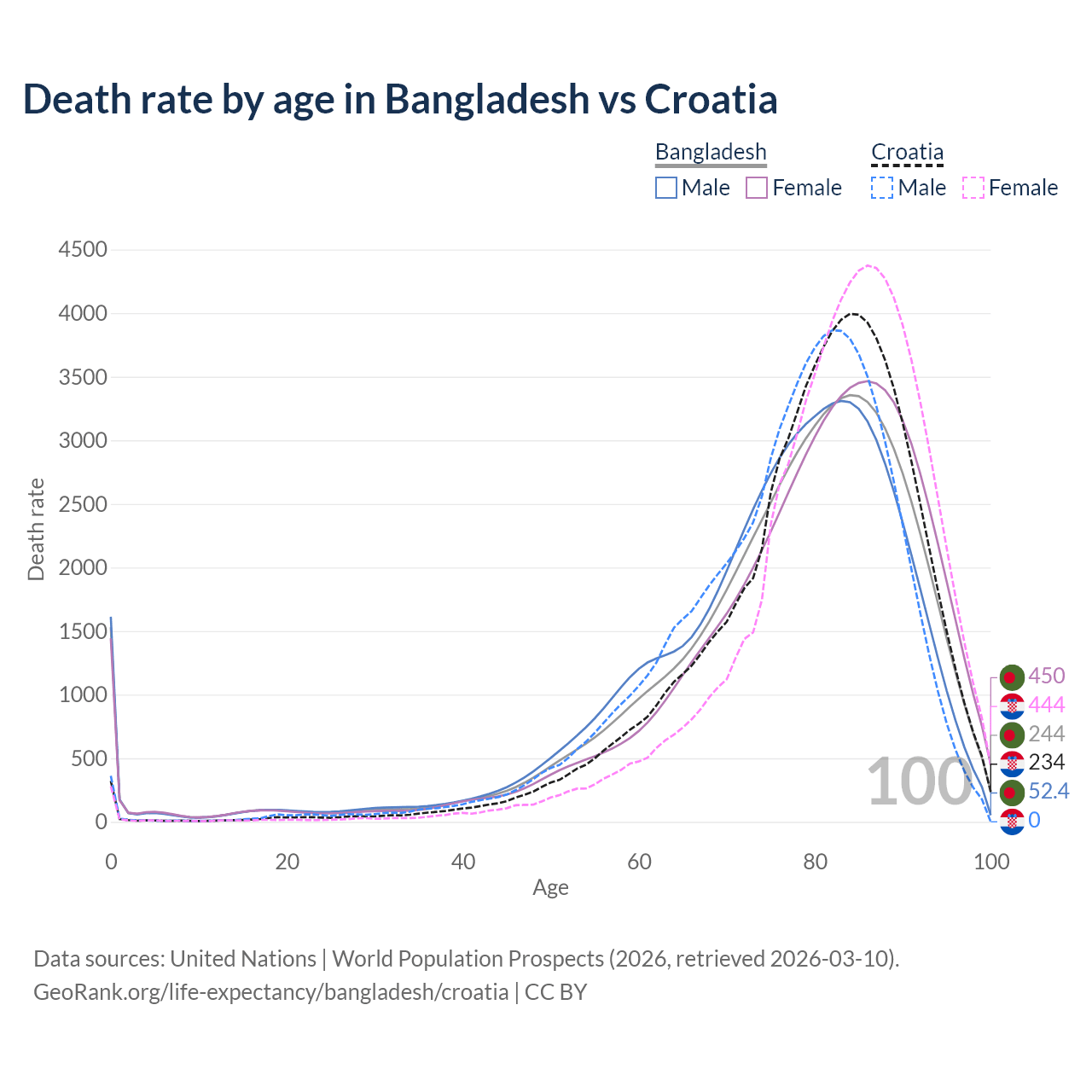 In Bangladesh, the most common age of death is 84, compared to 84 in Croatia. The median age of death is 79.7 in Bangladesh and 81.7 in Croatia, meaning only half of each cohort is expected to live past that age.