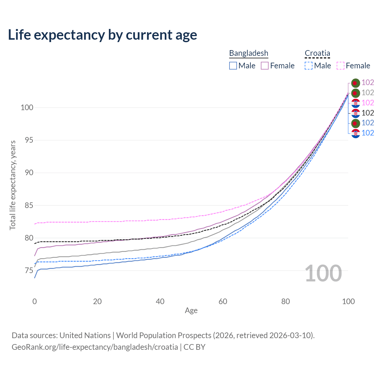 This life expectancy calculator shows the odds of living to 100, 95, 90, and below based on current age for both males and females in Bangladesh and Croatia, along with mean and median age of death. The calculations are based on the 2026 life tables (actuarial tables) from the UN World Population Prospects.