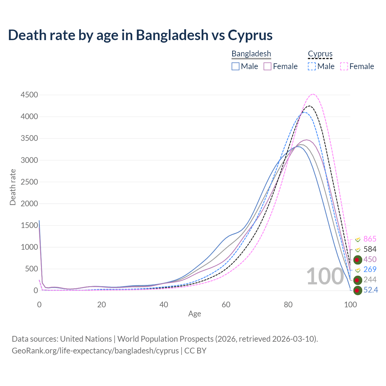In Bangladesh, the most common age of death is 84, compared to 87 in Cyprus. The median age of death is 79.7 in Bangladesh and 84.3 in Cyprus, meaning only half of each cohort is expected to live past that age.