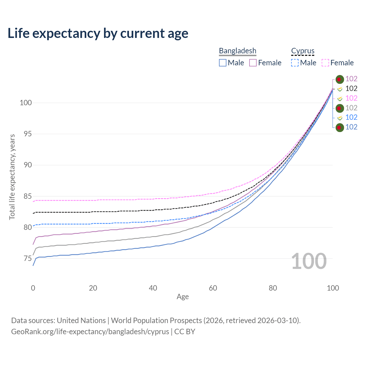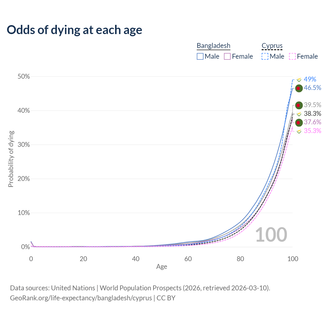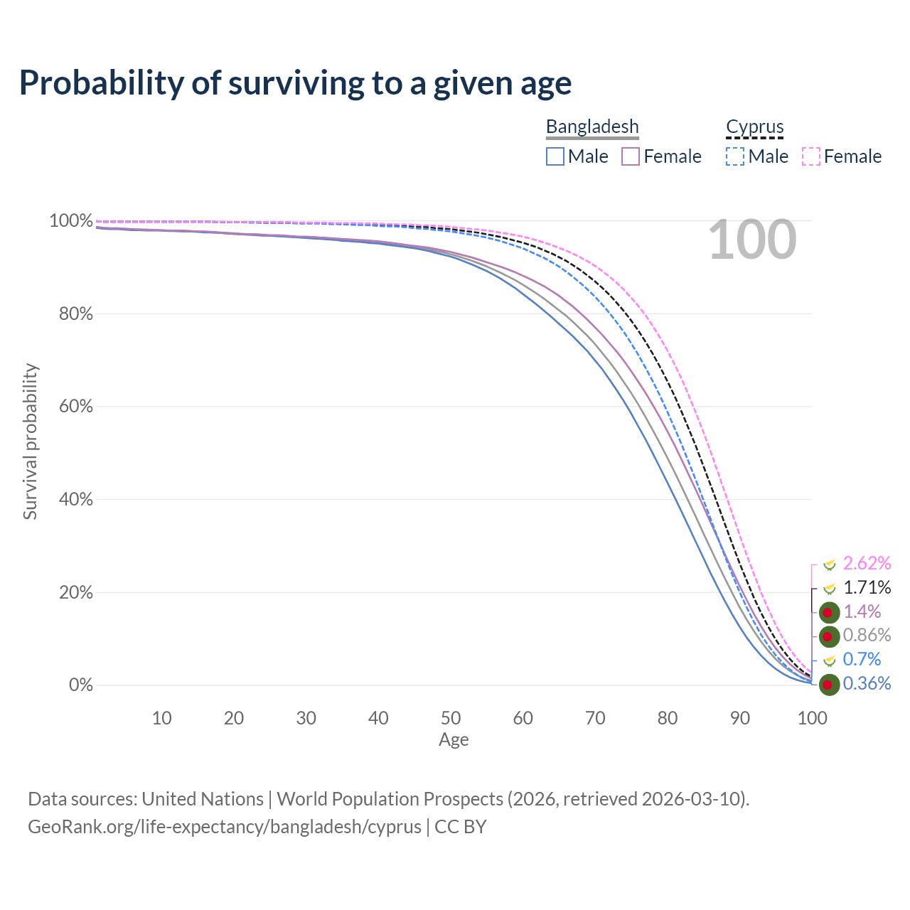 This life expectancy calculator shows the odds of living to 100, 95, 90, and below based on current age for both males and females in Bangladesh and Cyprus, along with mean and median age of death. The calculations are based on the 2026 life tables (actuarial tables) from the UN World Population Prospects.